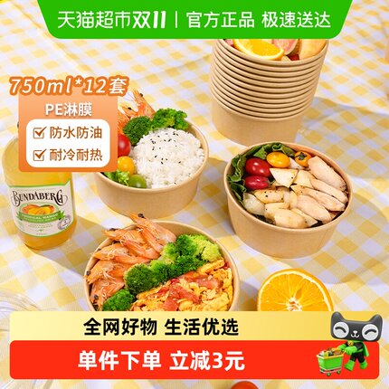 云蕾一次性餐盒牛皮纸带盖圆碗750ml*12套水果沙拉便当野餐打包盒