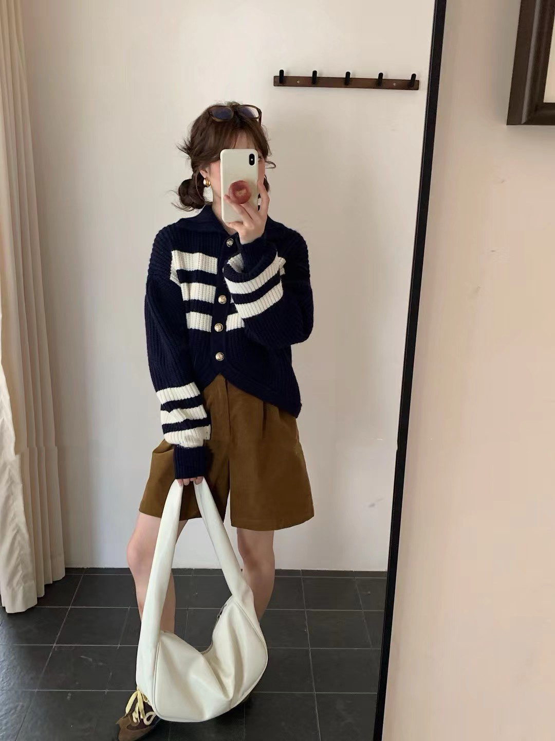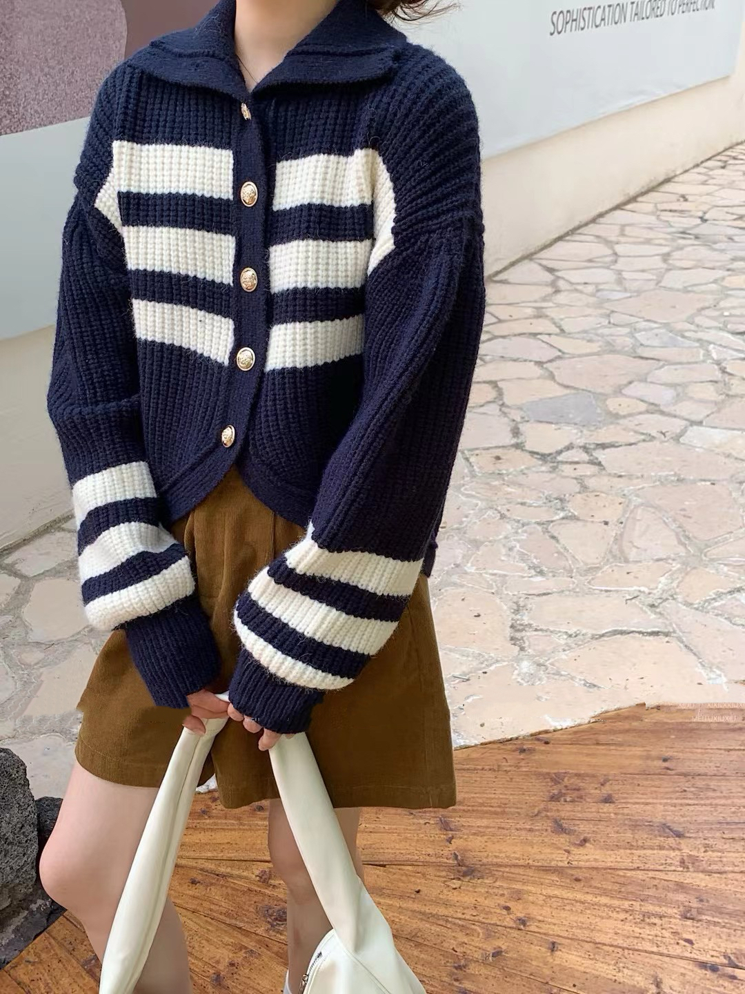设计感撞色条纹针织衫上衣女秋冬新款短款小个子毛衣外套女