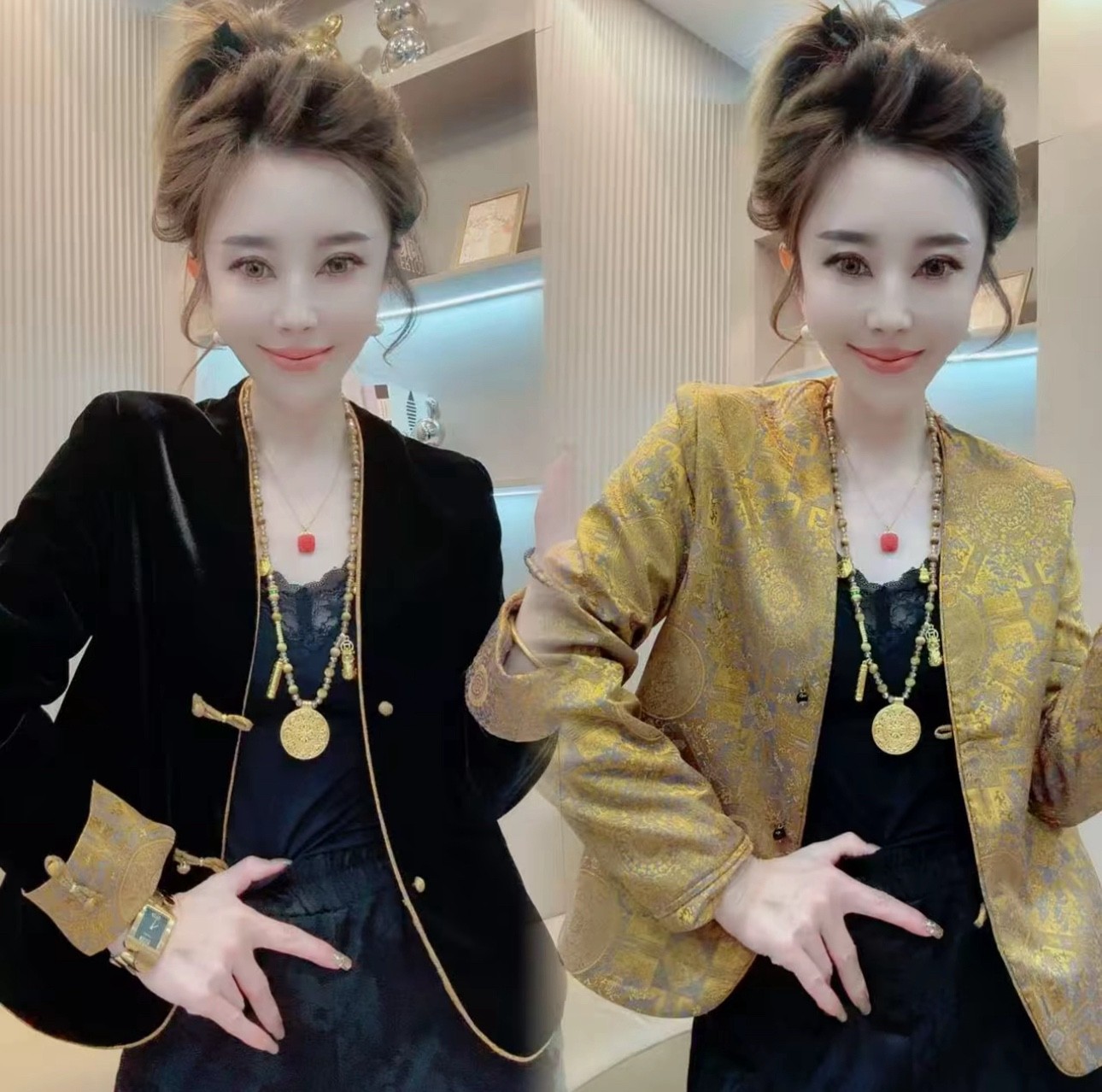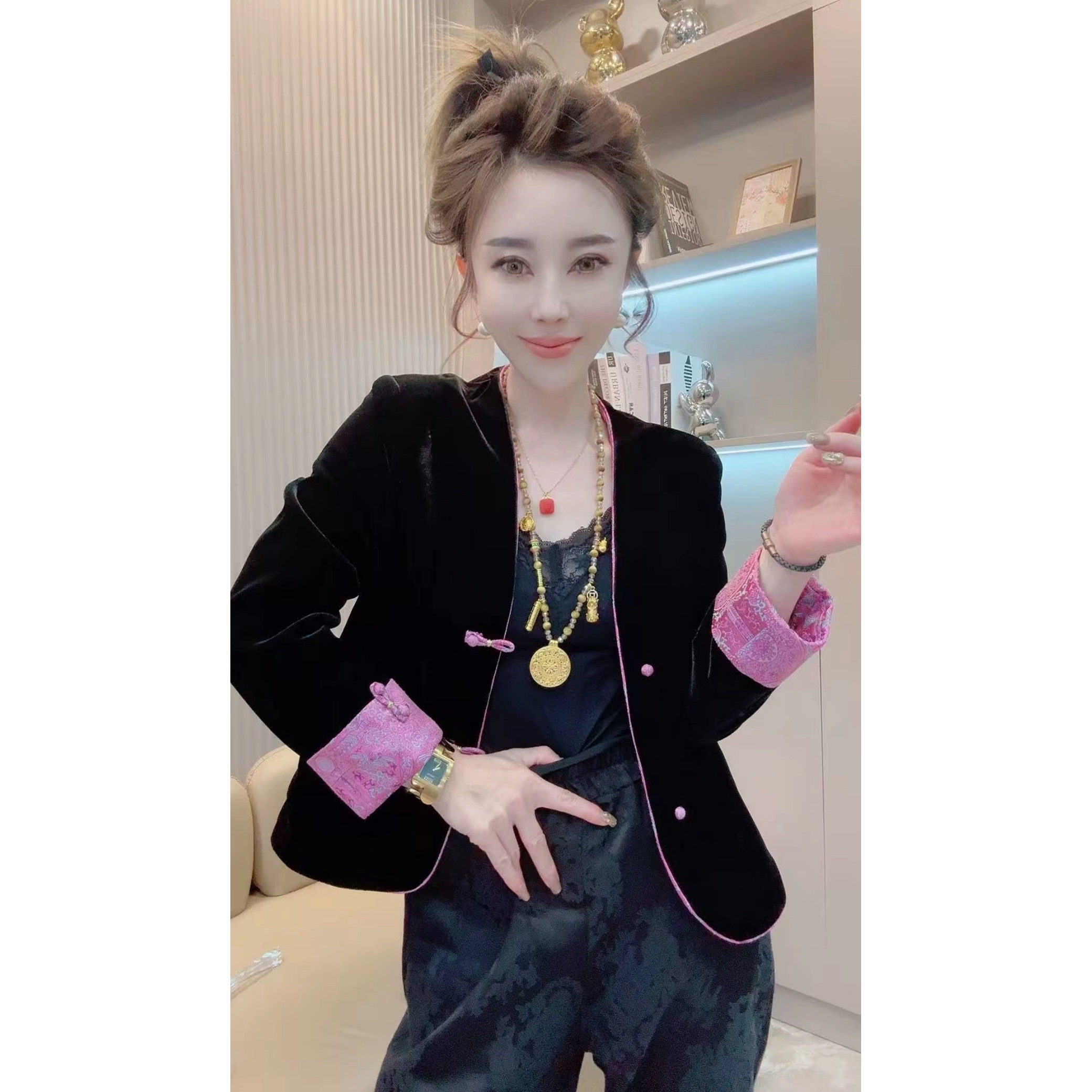 新中式国风盘扣丝绒真丝提花双面穿宽松短外套女2025春秋唐装上衣