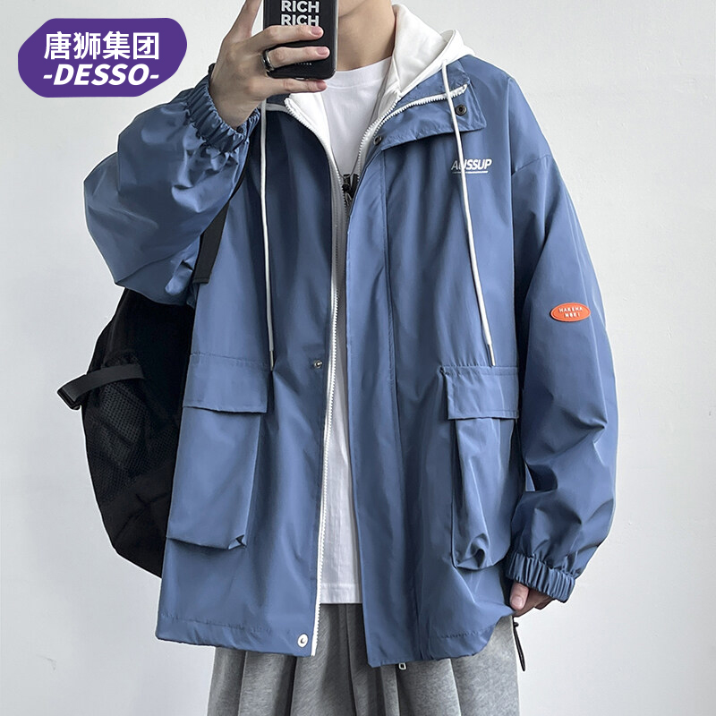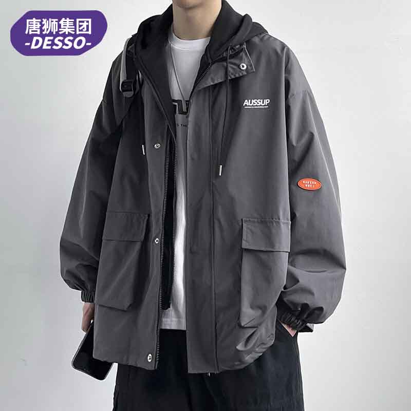 唐狮集团DESSO春秋美式连帽外套男士纯色工装假两件夹克男潮上衣