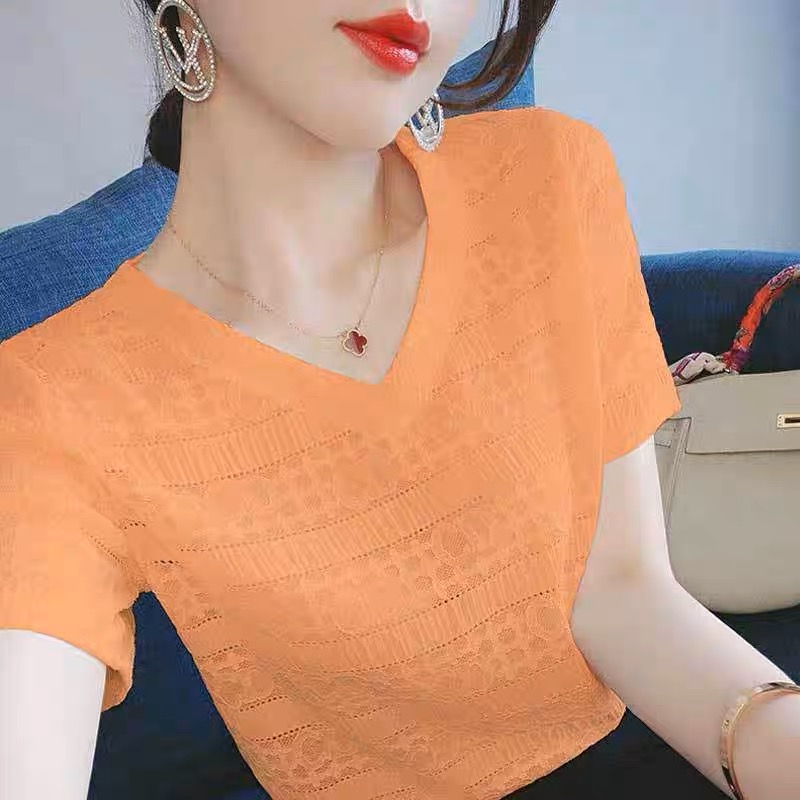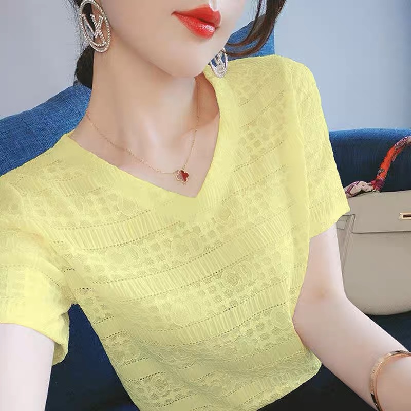 短袖t恤女2025夏季新款显瘦百搭宽松V领蕾丝气质雪纺衫打底衫上衣