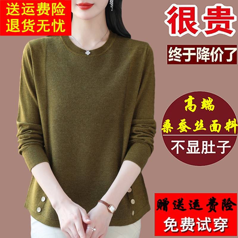 胖mm大码长袖t恤女宽松桑蚕丝妈妈遮肚休闲上衣针织打底小衫春秋