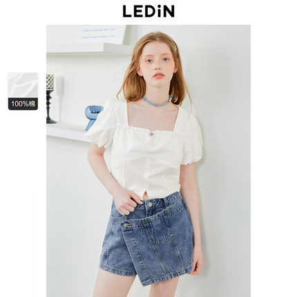 乐町白色花苞短袖上衣新款可爱甜美少女风方领显瘦全棉雪纺衫