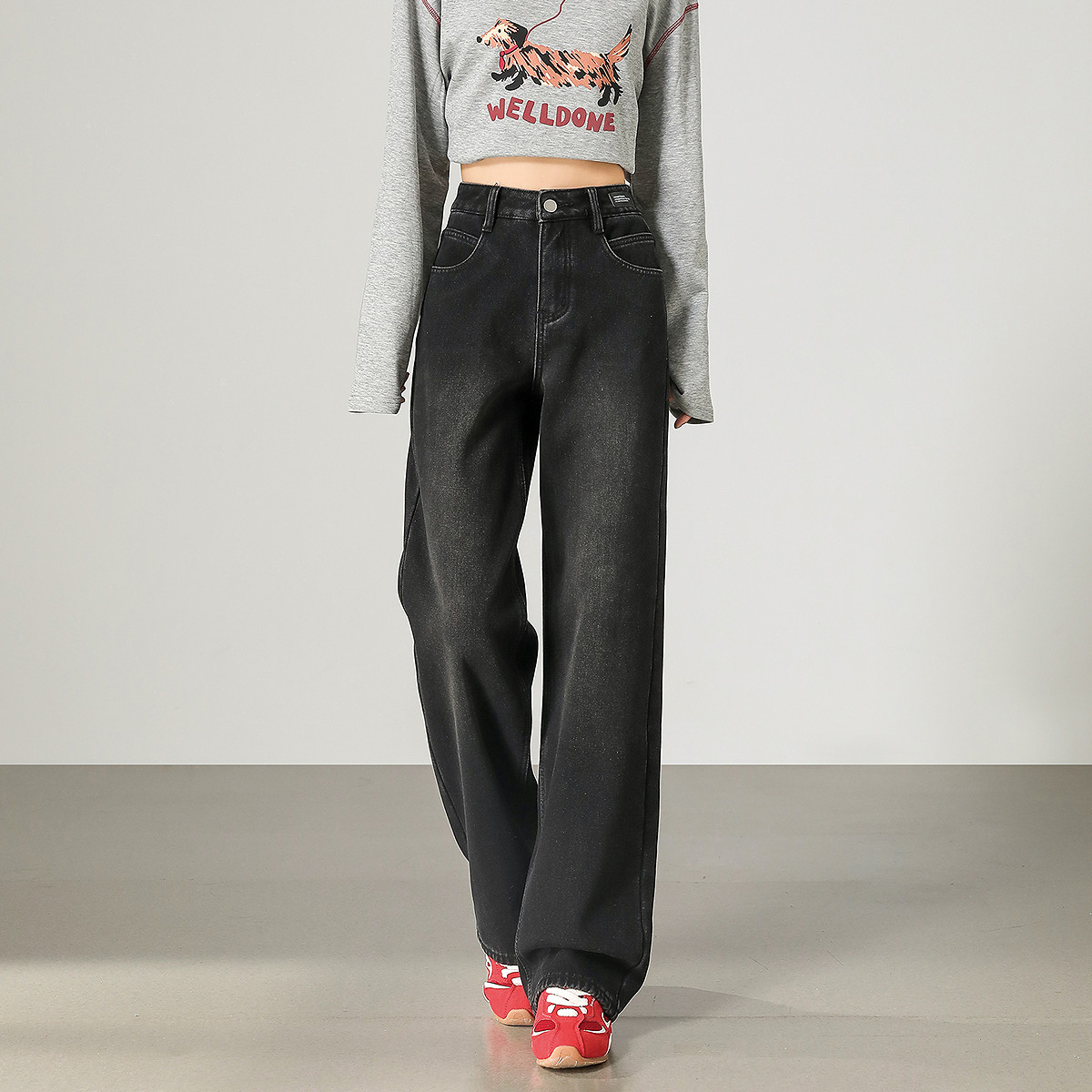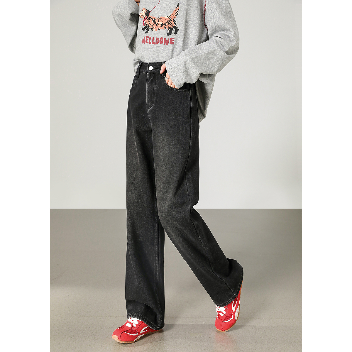 唐狮秋冬季直筒牛仔长裤女基础百搭加绒加厚显瘦碳黑色高级感tuTA