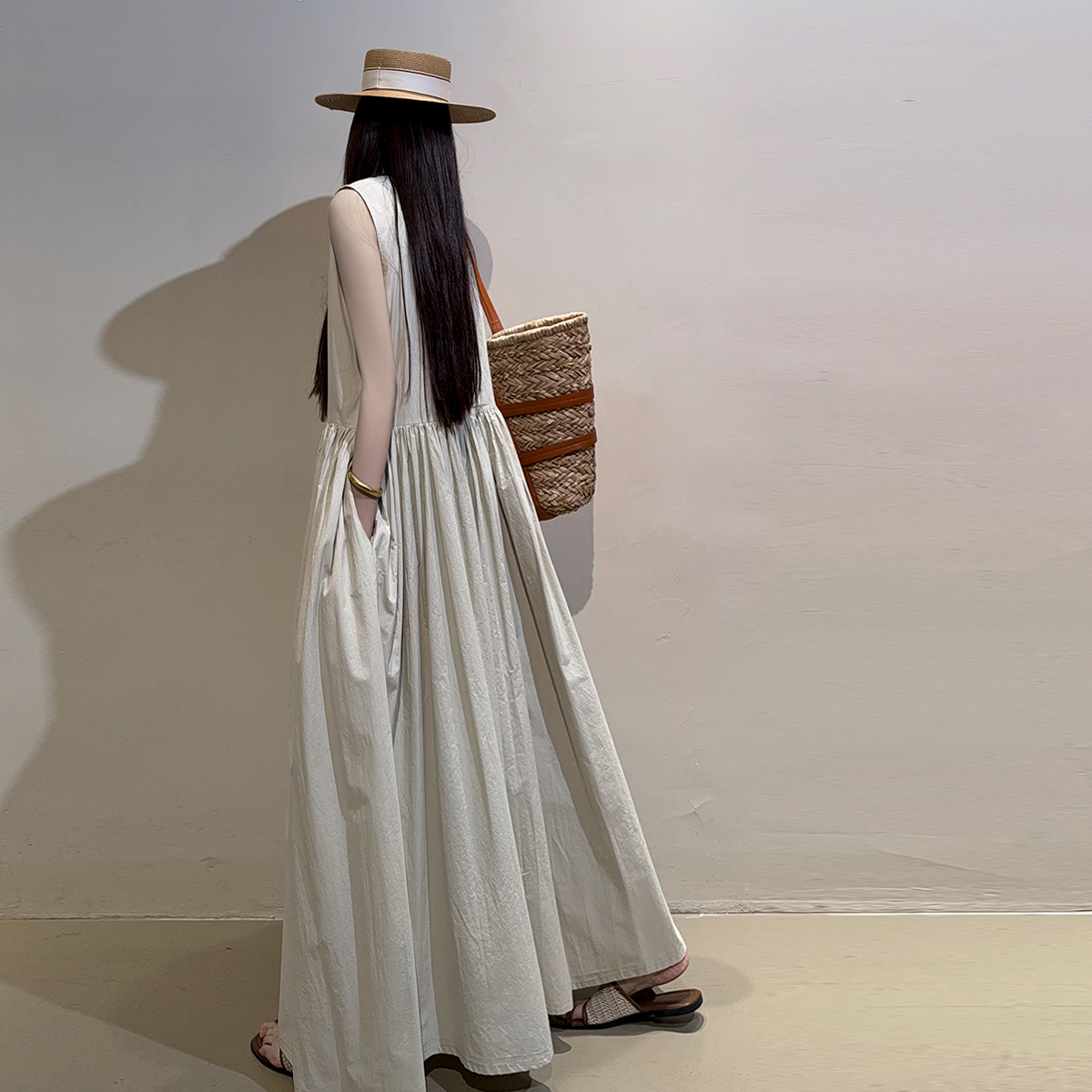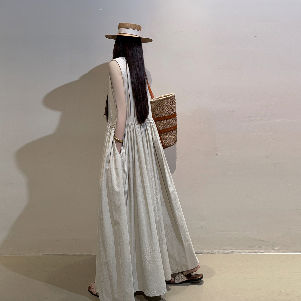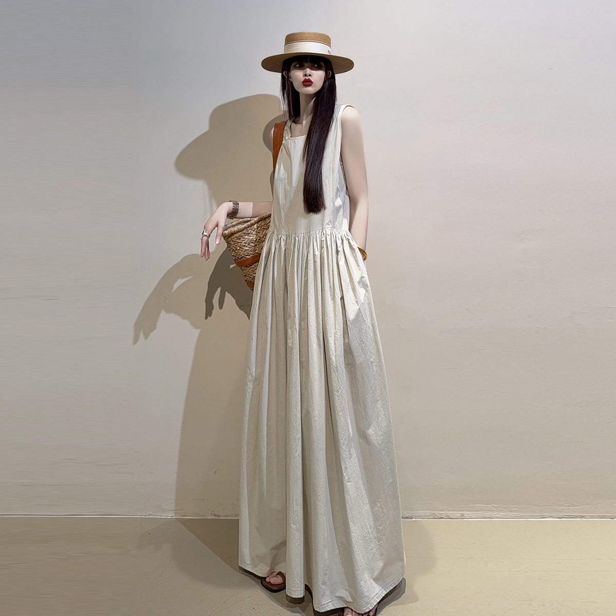 2025夏纯棉文艺复古韩版宽松大摆背心裙长款及踝慵懒风百搭连衣裙