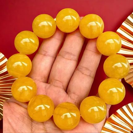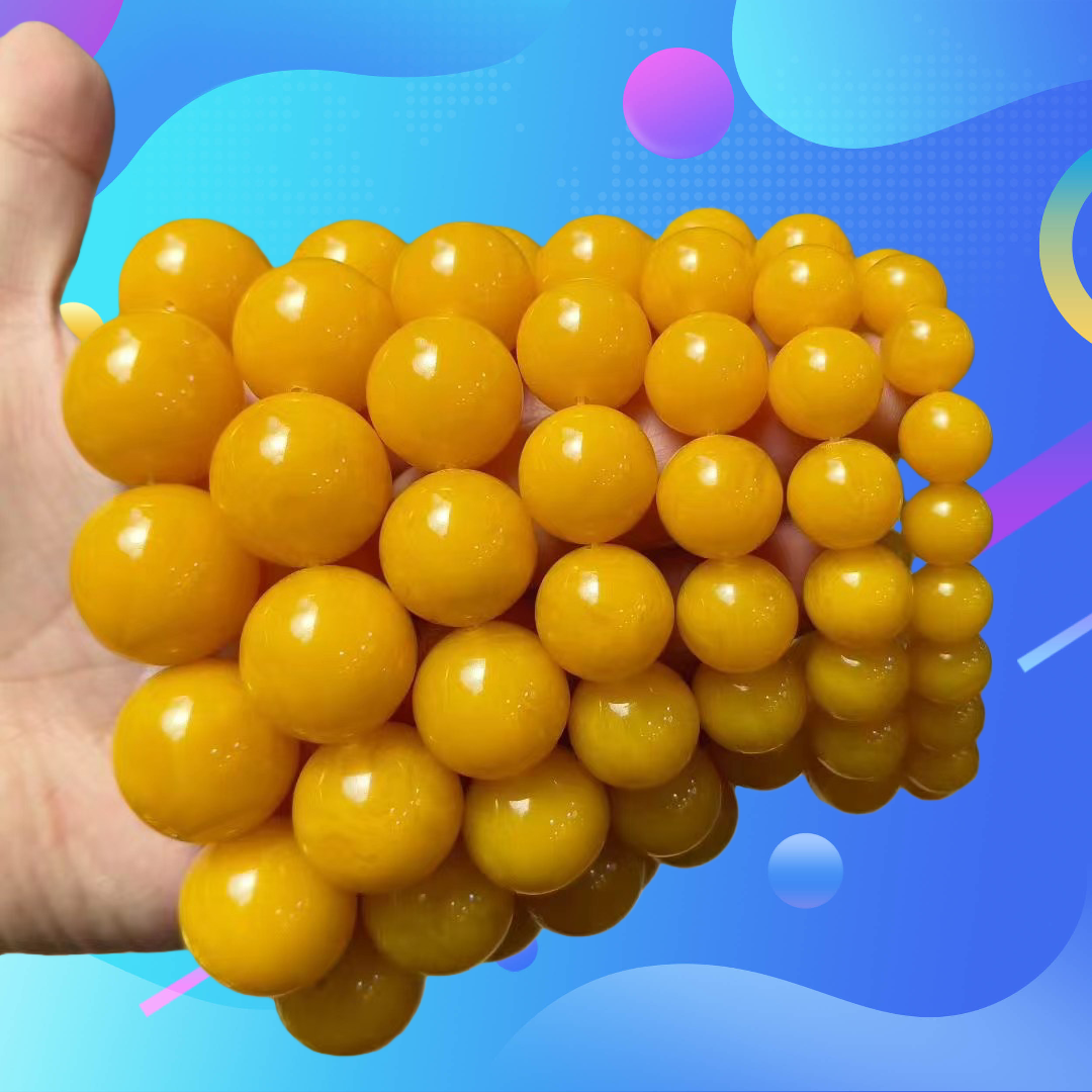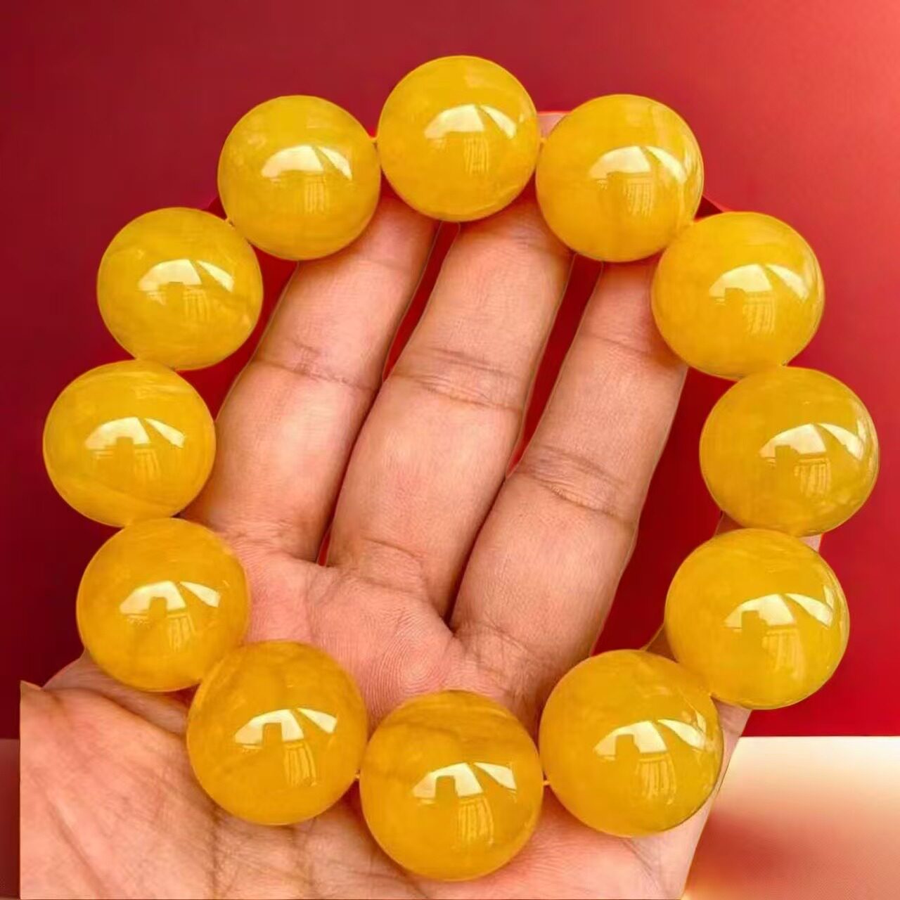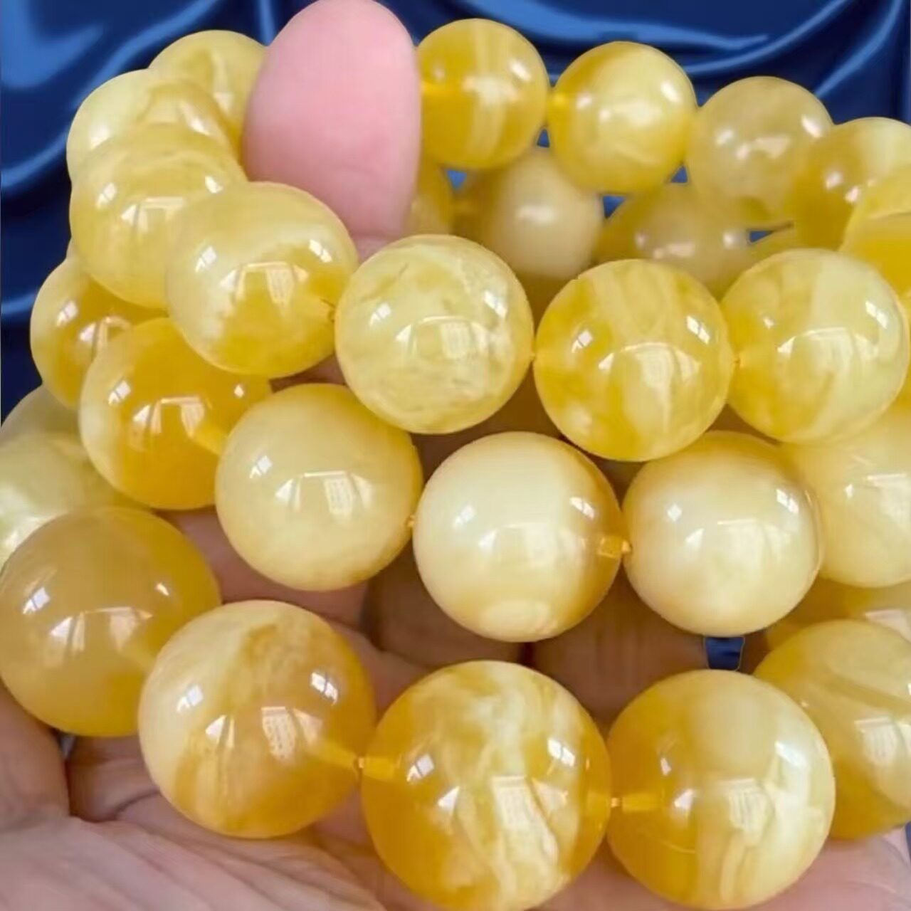 天然蜜蜡手串单圈圆珠子鸡油黄老蜜蜡手链男女款琥珀白妖飘花溶洞