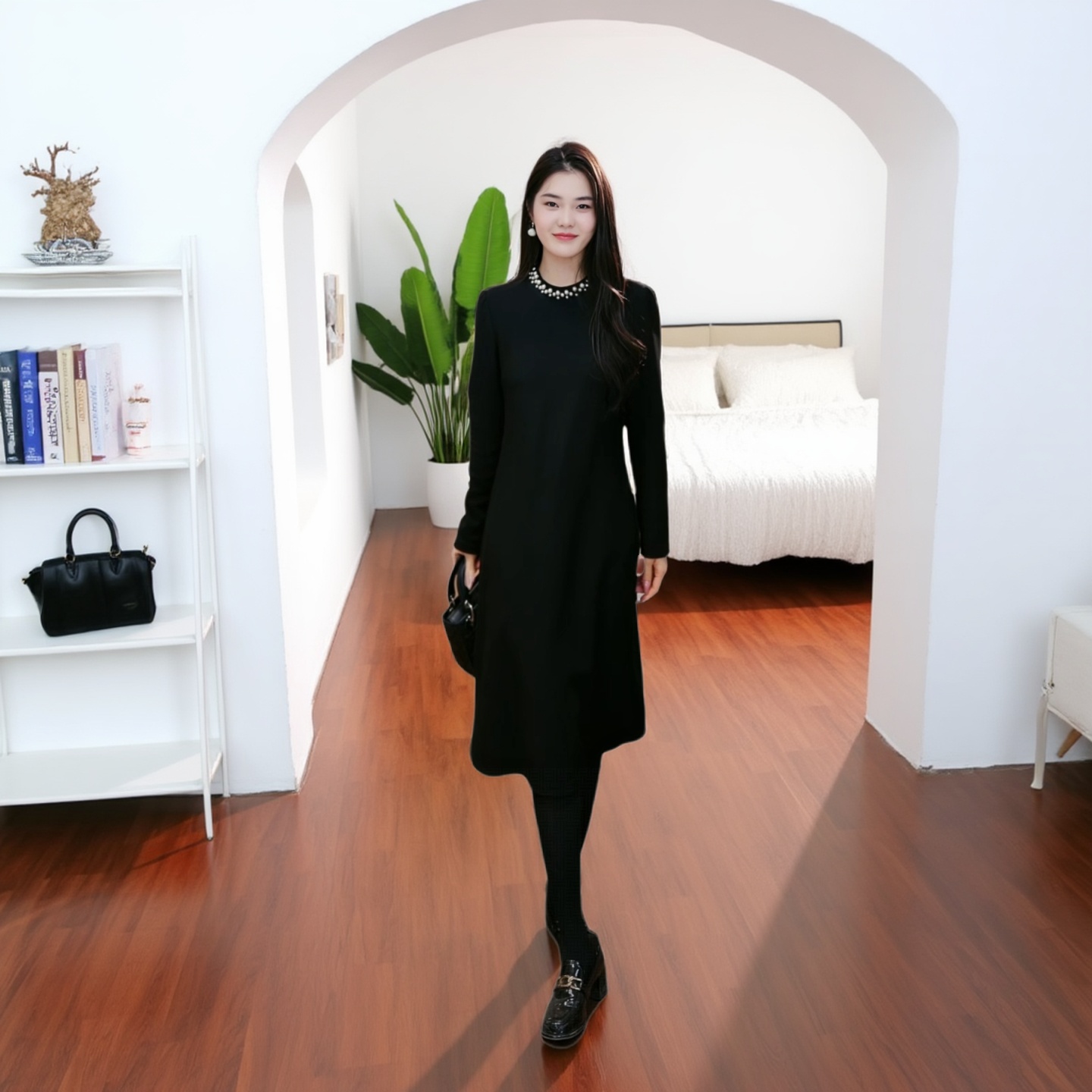 大码胖MM冬季新款加绒加厚钉珠连衣裙女长袖收腰气质轻熟风名媛裙