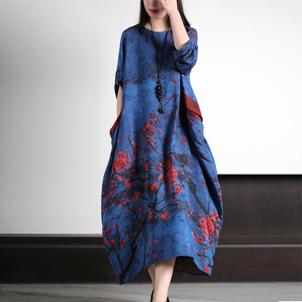 兮风宽松文艺茧型真丝缎连衣裙简约大方撞色拼接圆领复古长裙春夏