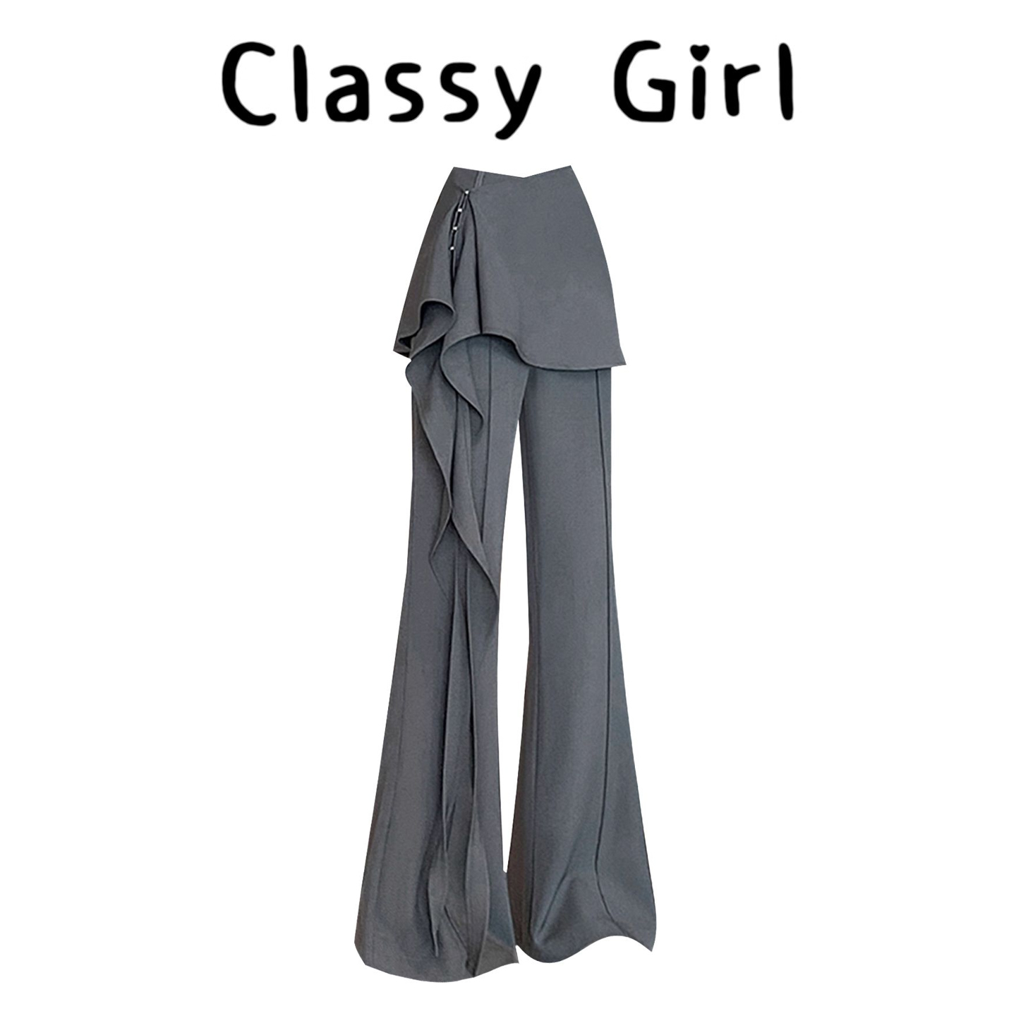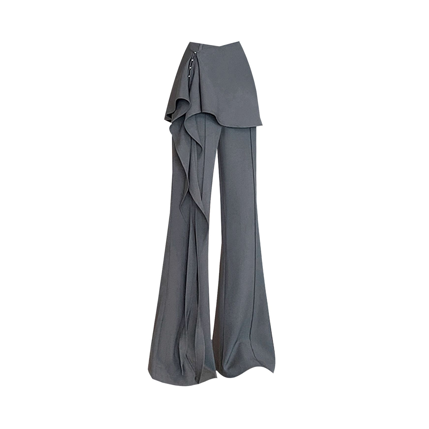 灰色微喇裤子女2025年新款荷叶边围裙式西装裤显瘦不贴腿喇叭长裤