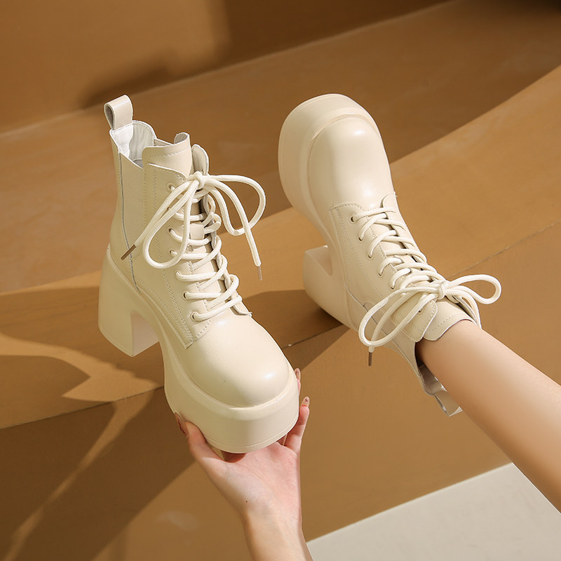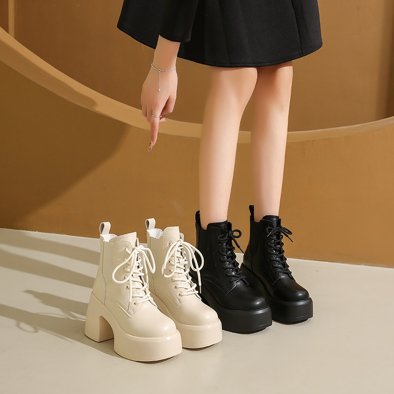 真皮厚底短靴女超高跟白色马丁靴2025秋冬新款小个子增高系带靴子