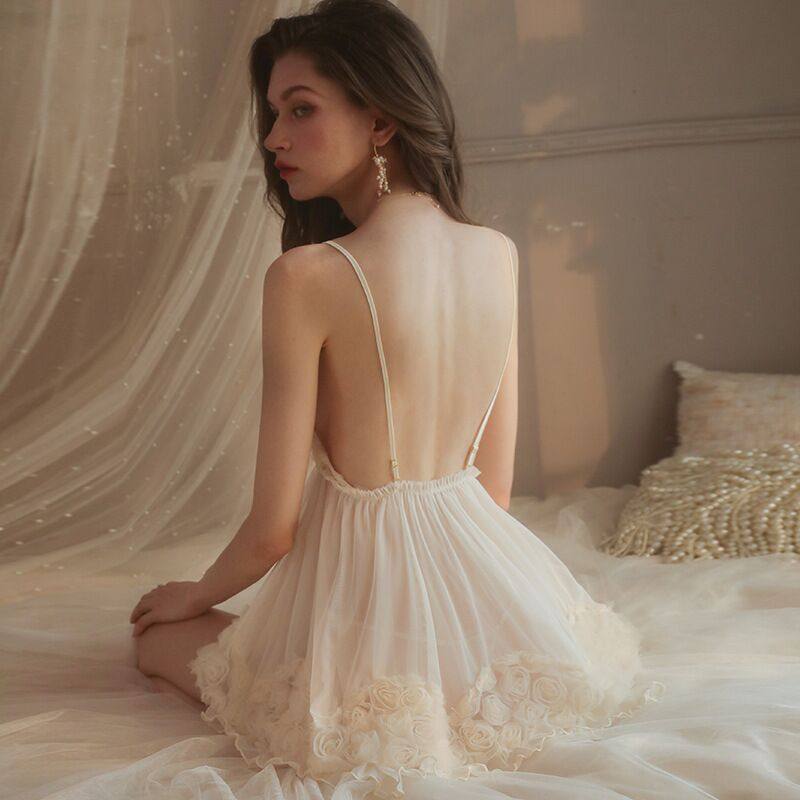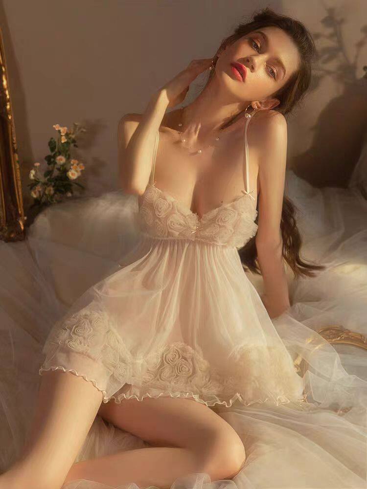 性感睡衣女2024新款花朵百褶裙吊带蕾丝网纱透视纯欲公主睡裙夏季