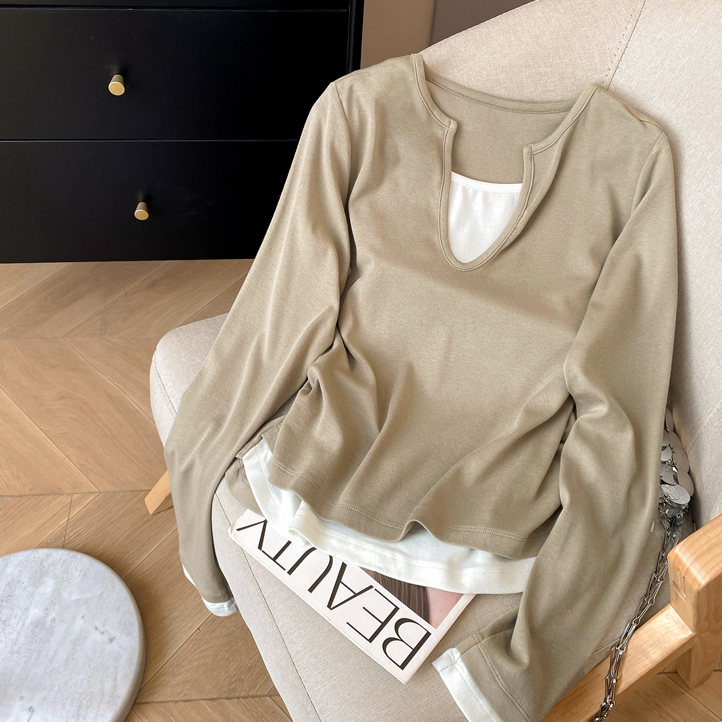 小C家 撞色v领假两件长袖T恤女2025新款秋修身内搭打底衫拼接上衣