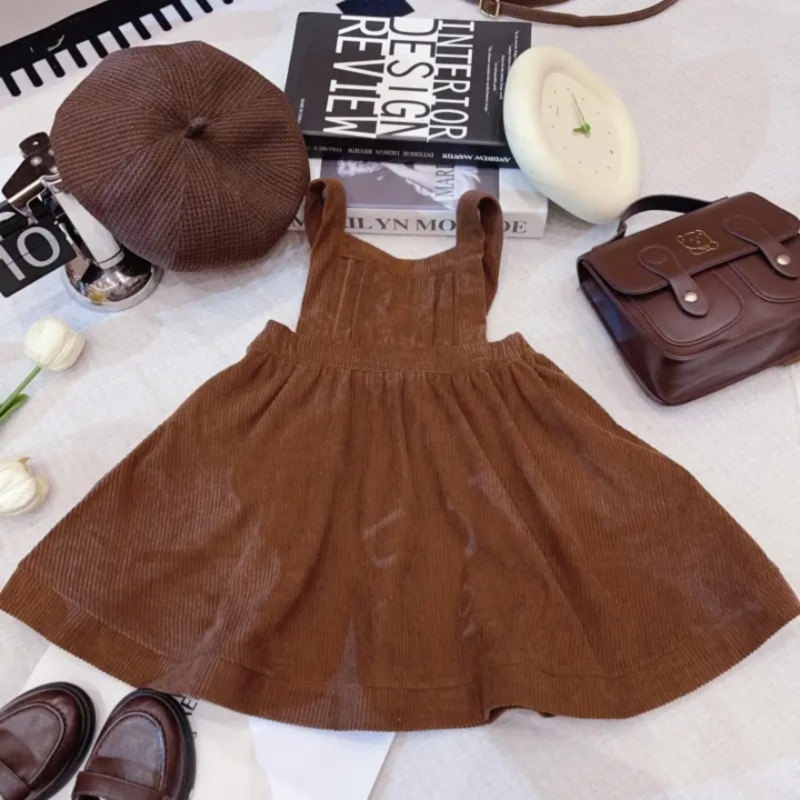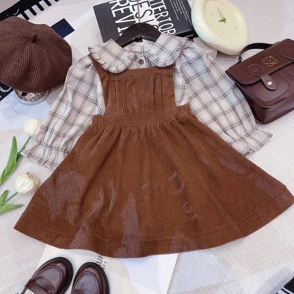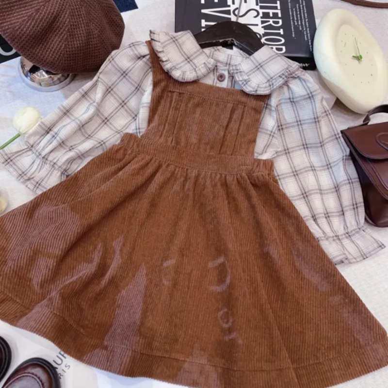春秋款女童学院风连衣裙套装洋气复古格子娃娃领衬衫背带裙