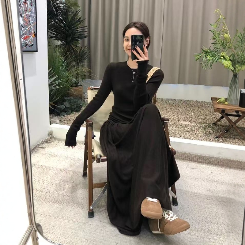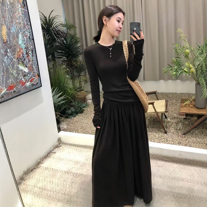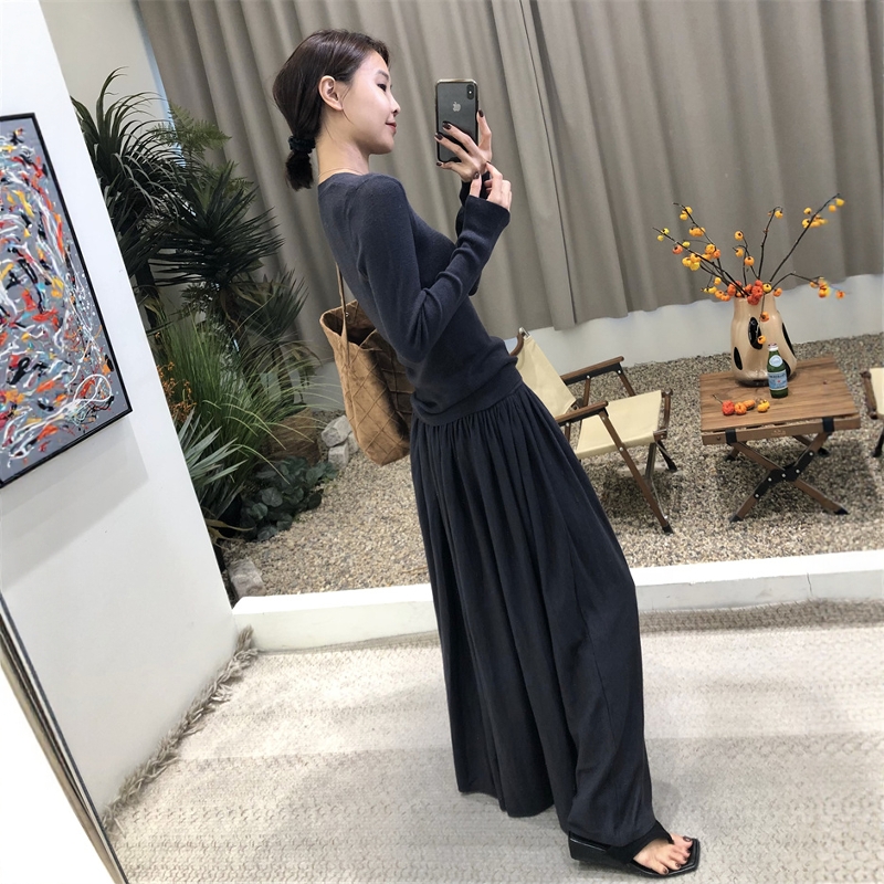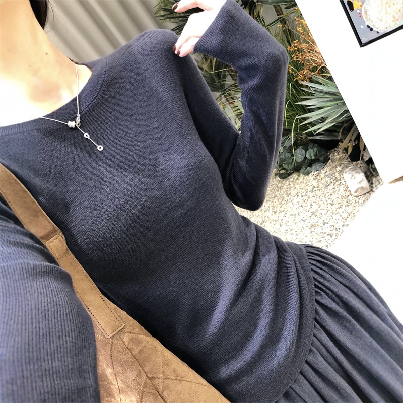 2025法式高品质羊毛套装女修身长袖t恤打底衫半身百褶长裙两件套