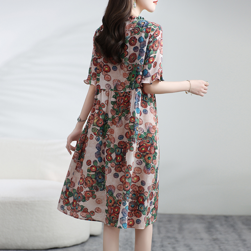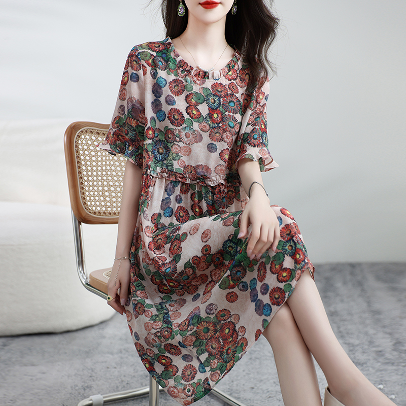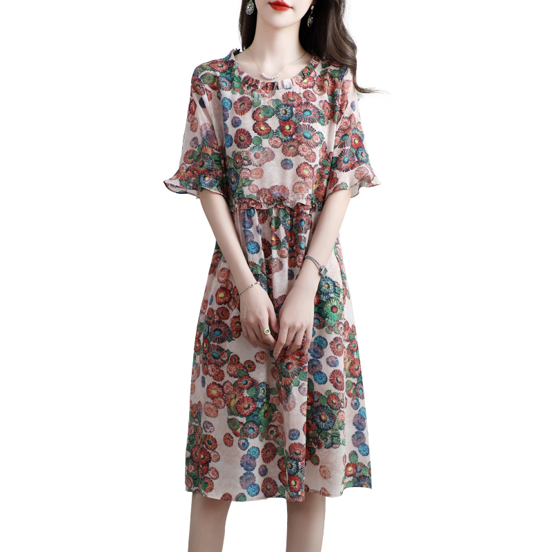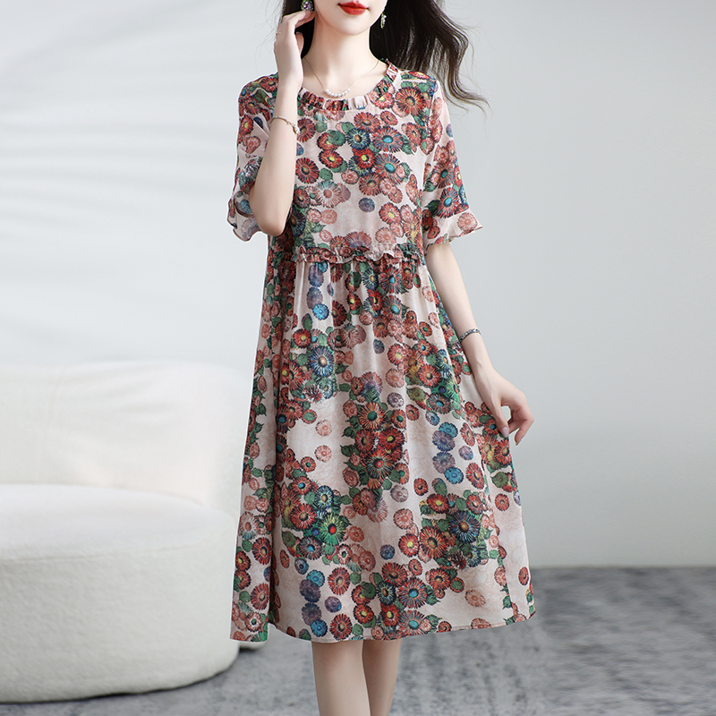 双绉真丝连衣裙女妈妈透气凉快小个子气质桑蚕丝印花显瘦裙子夏季