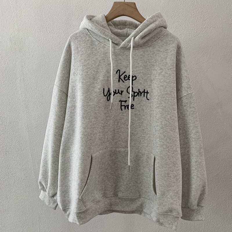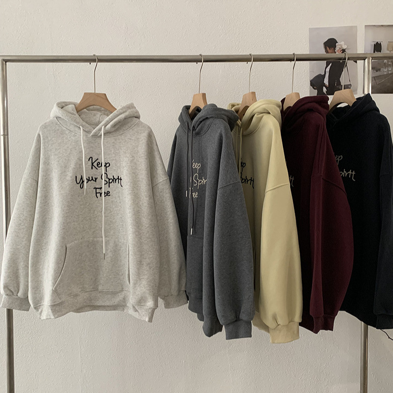 东大门欧货~加绒加厚毛巾绣字母连帽宽松长袖中长款套头卫衣韩系