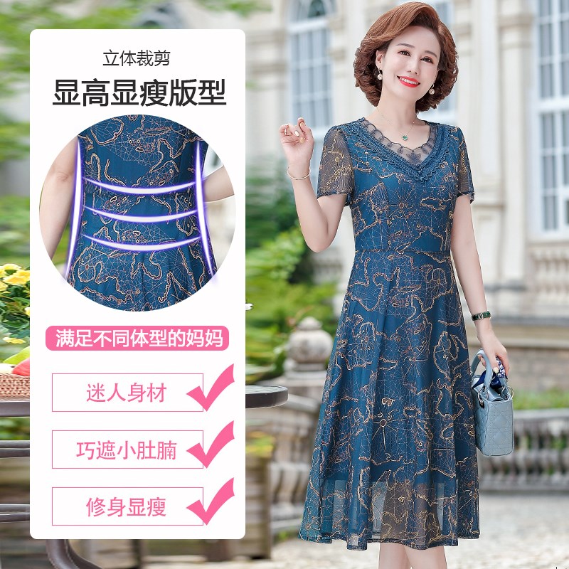 中年气质短袖网纱雪纺连衣裙中老年女装夏季新款时尚洋气妈妈裙子