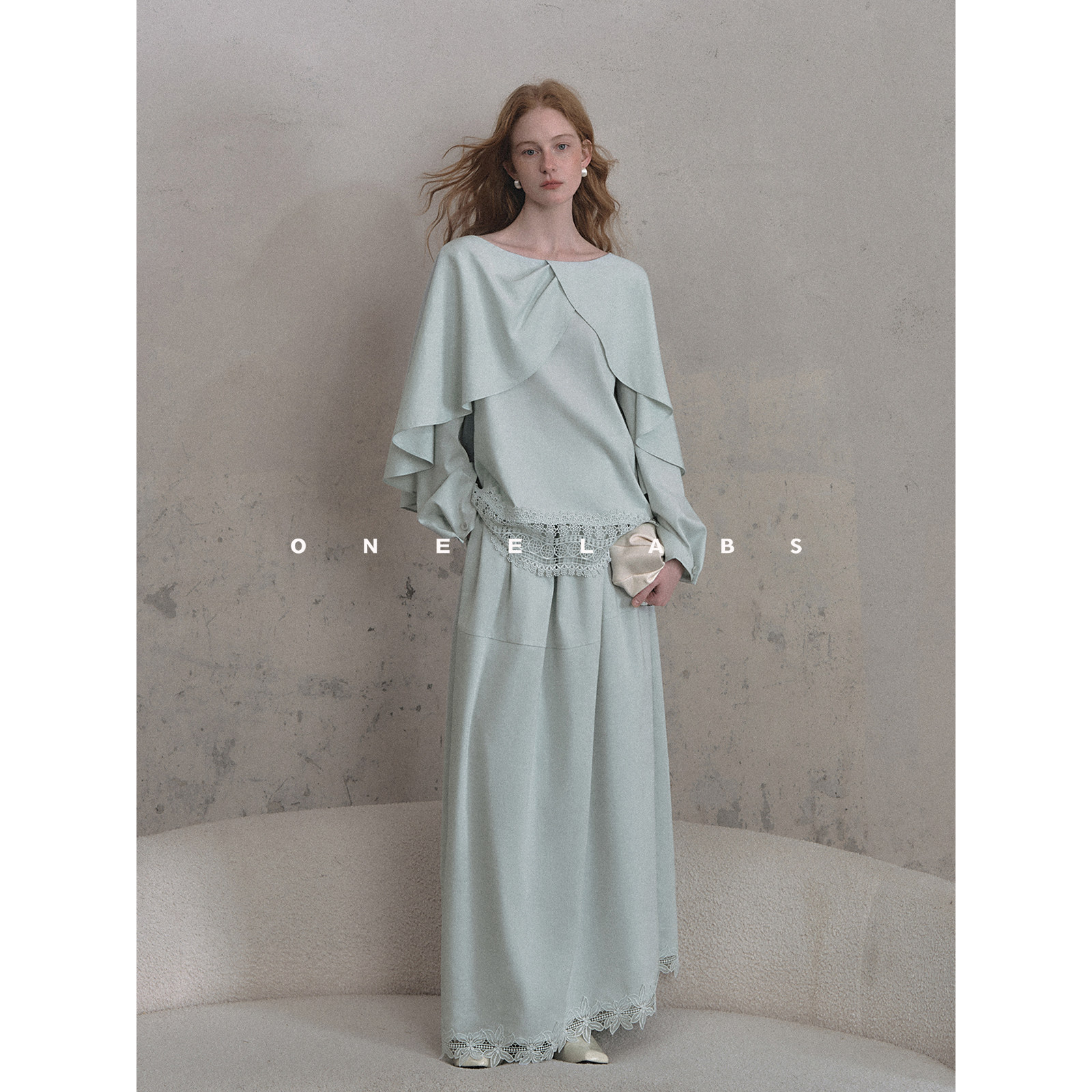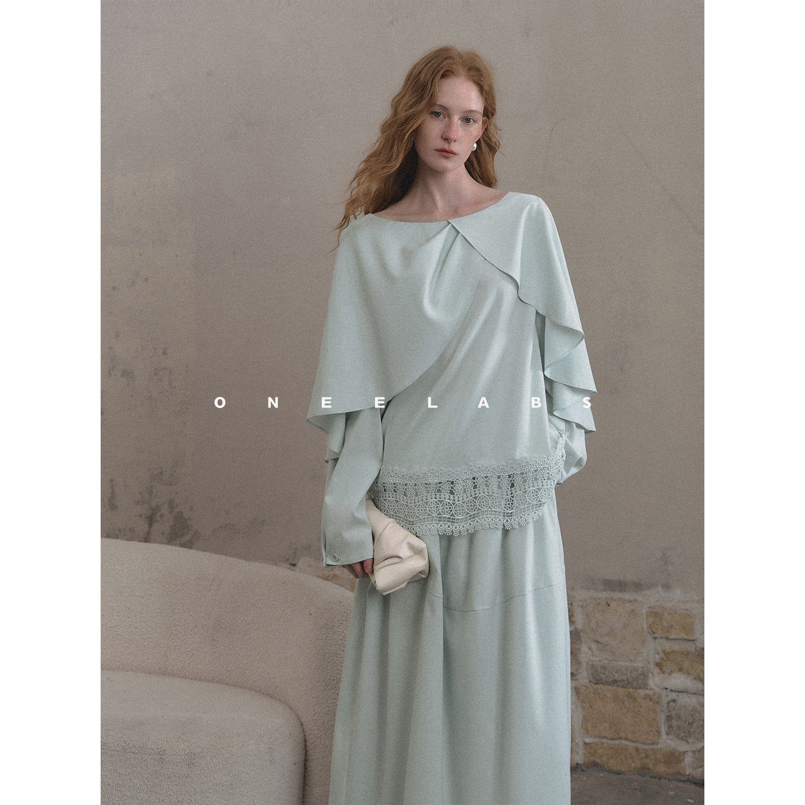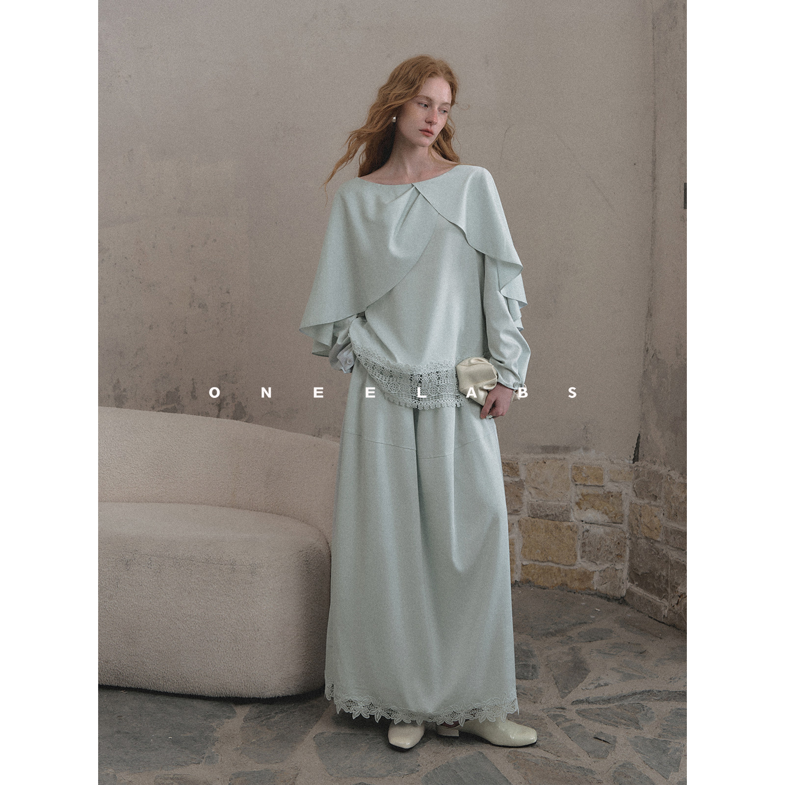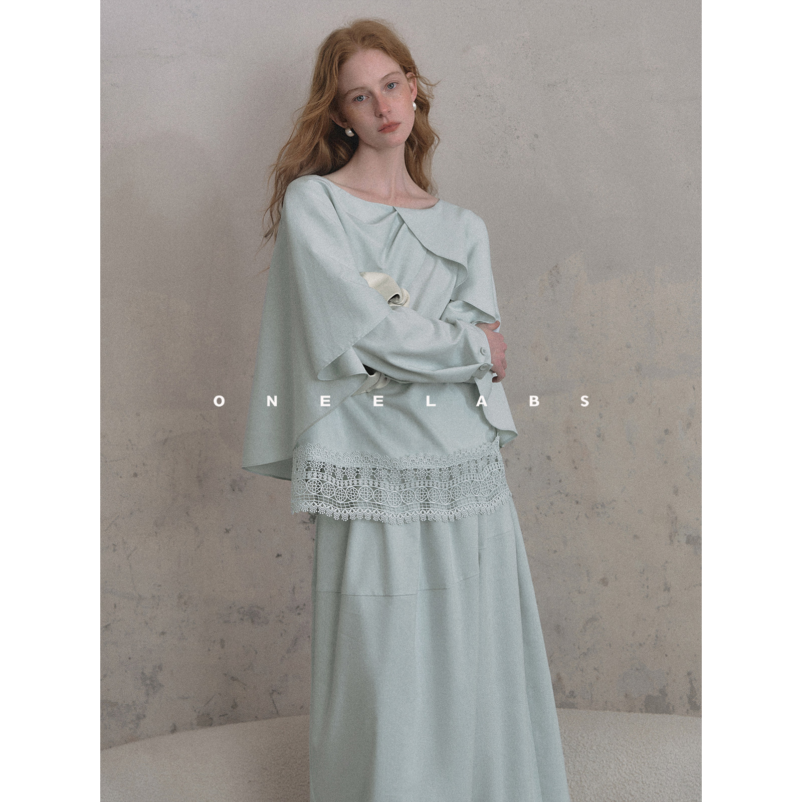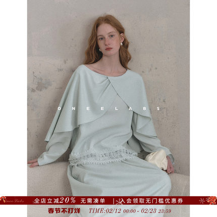 ONEELABS原创品牌 莱塞尔/亚麻混纺 蓝色花边绣斗篷上衣+半裙套装