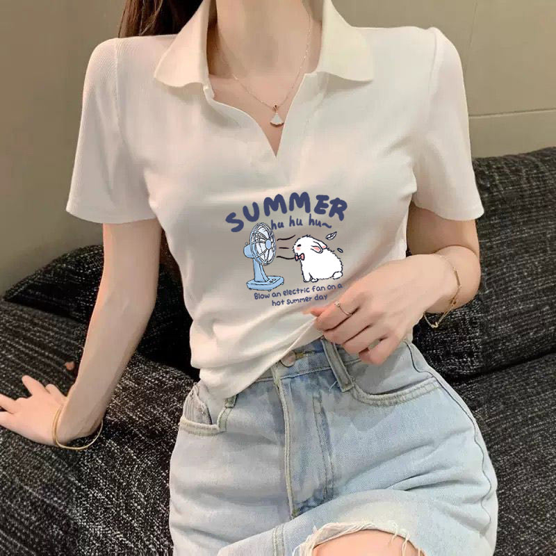 棉Polo领翻领螺纹短袖t恤女夏季法式气质v领修身显瘦短款百搭上衣