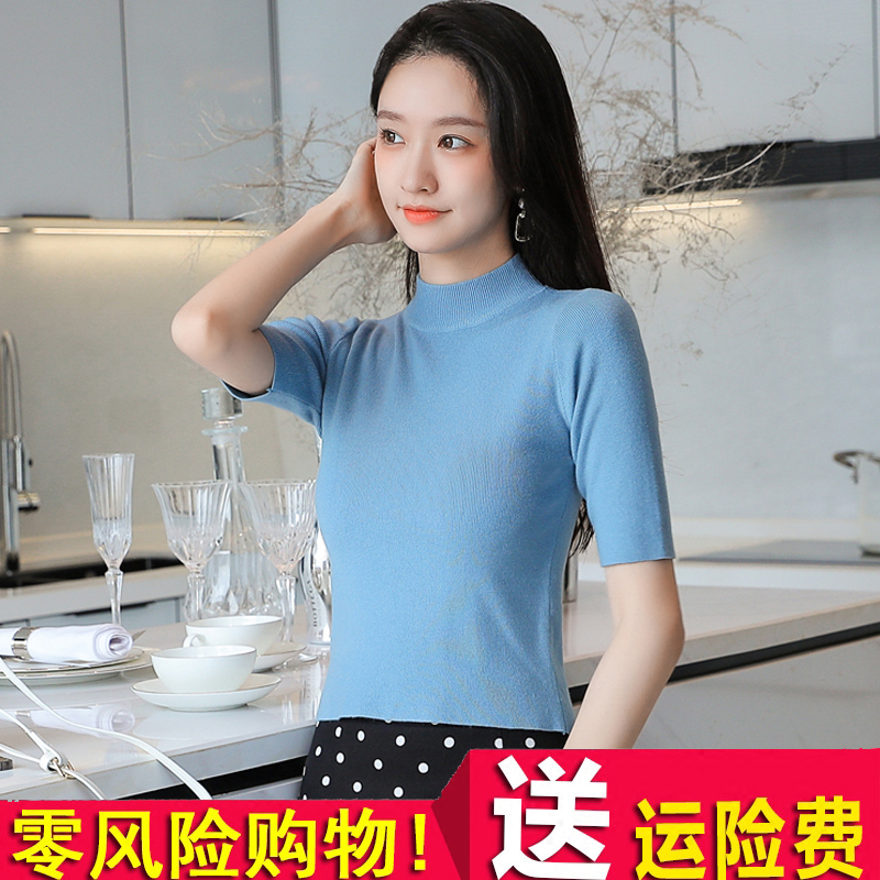 秋季针织衫女短款高腰修身小个子上衣薄款中袖打底衫半高领五分袖