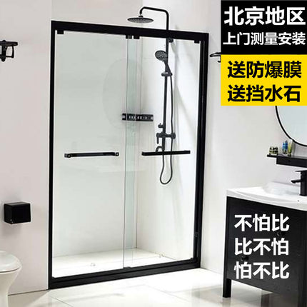 304不锈钢淋浴房一字隔断黑色钢化玻璃推拉移门屏风浴室干湿分离