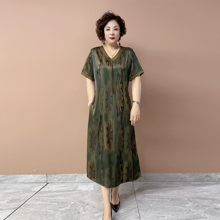 中年妈妈真丝连衣裙高档国风印花大码遮肉V领新中式老年人长裙女