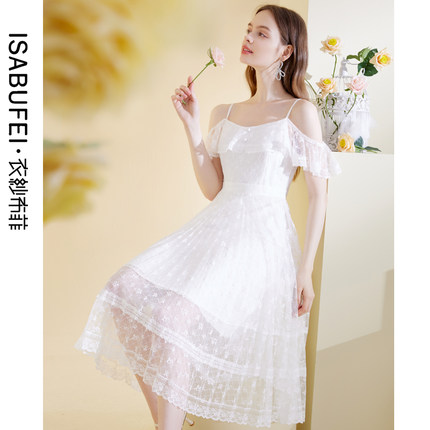 衣纱布菲朵菱白色蕾丝连衣裙新款女夏压褶浪漫一字肩吊带裙子