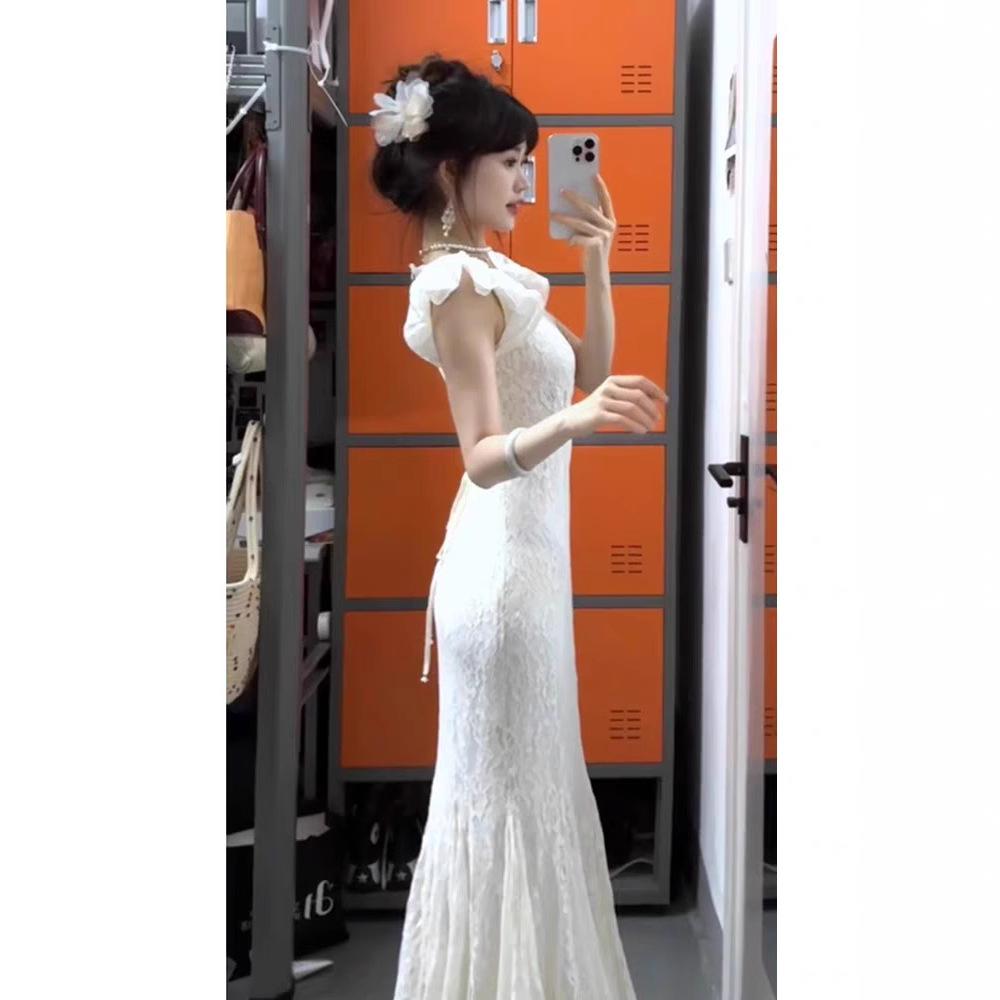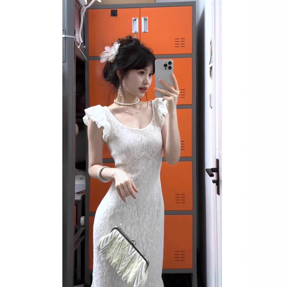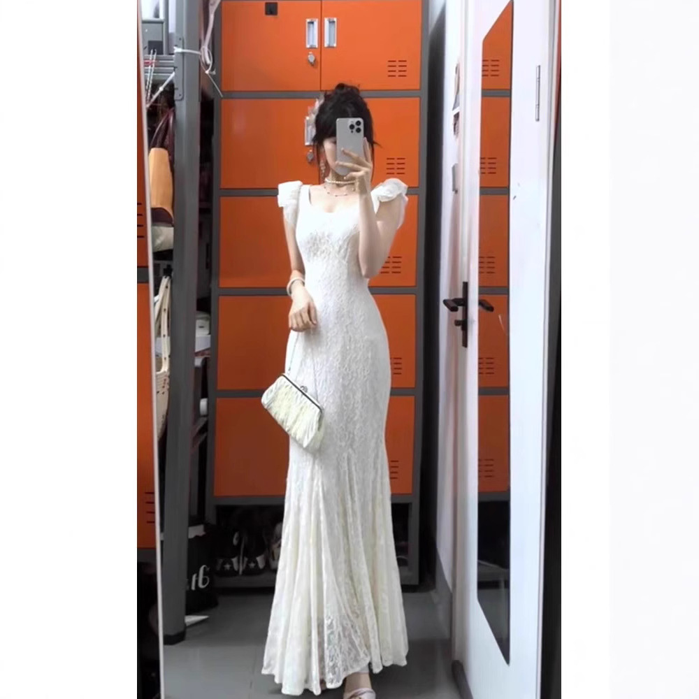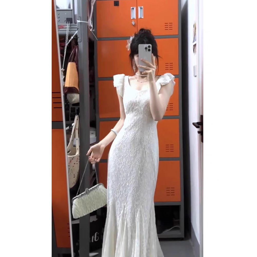 法式蕾丝重工小飞袖连衣裙女夏季新款纯欲风气质收腰鱼尾长裙子