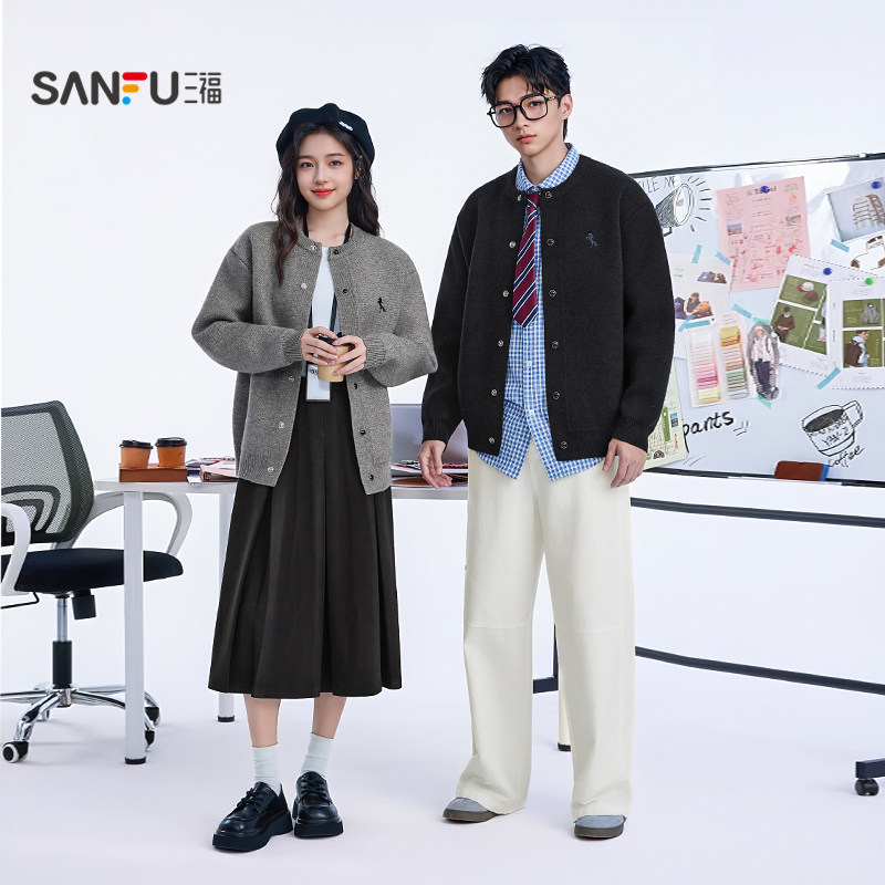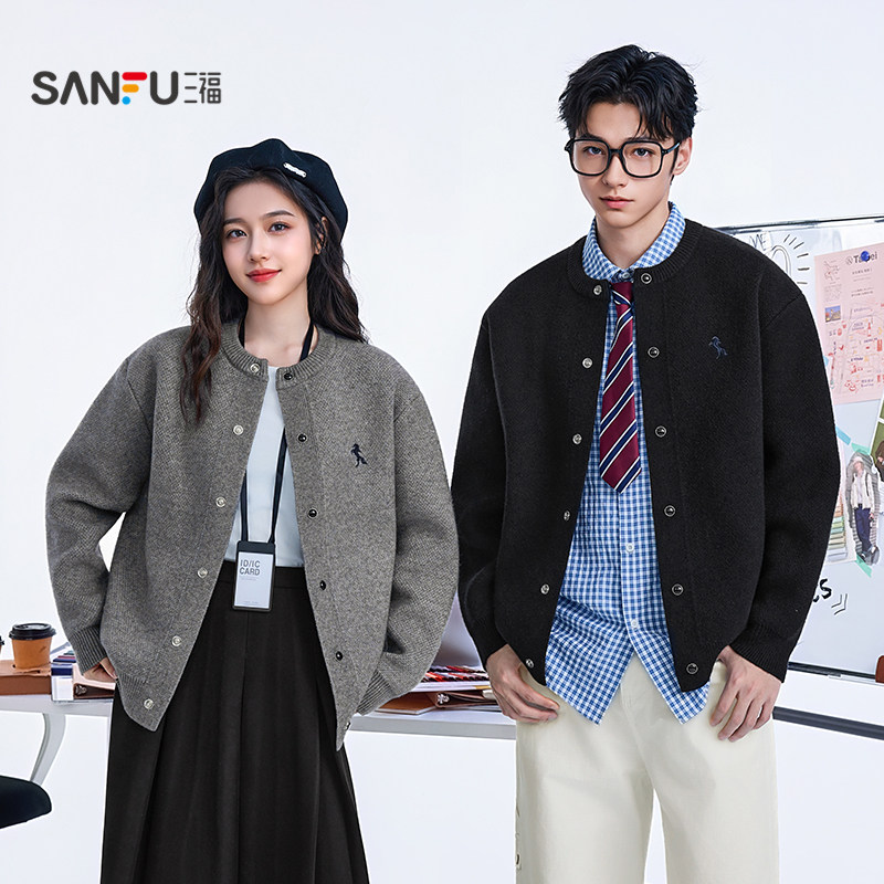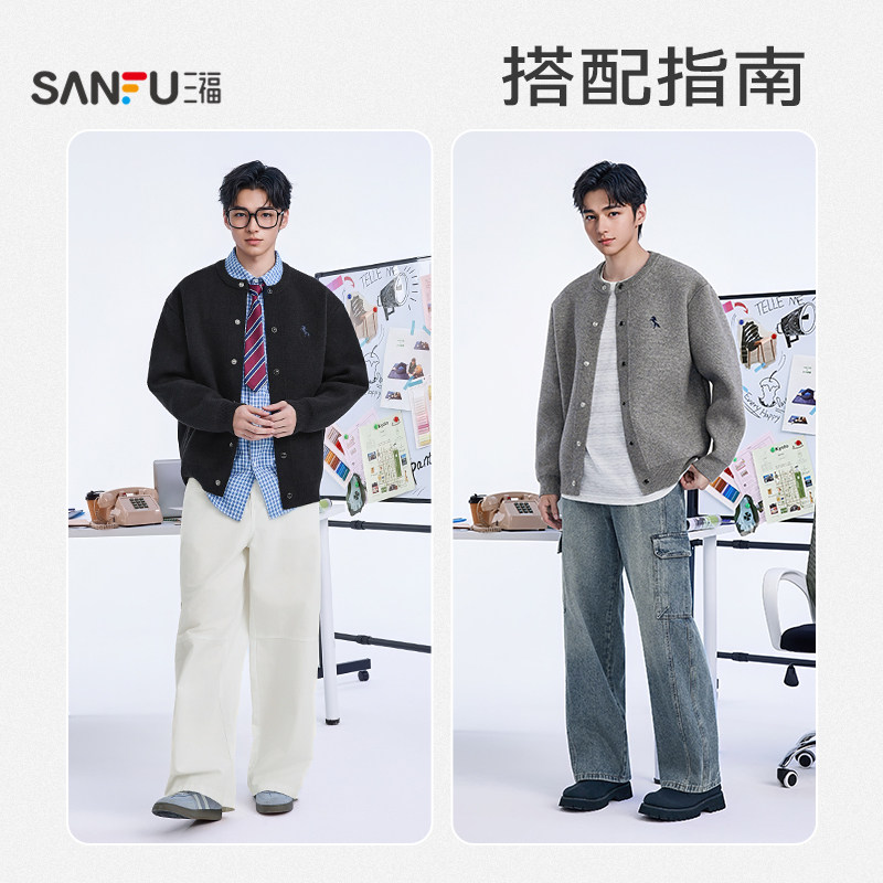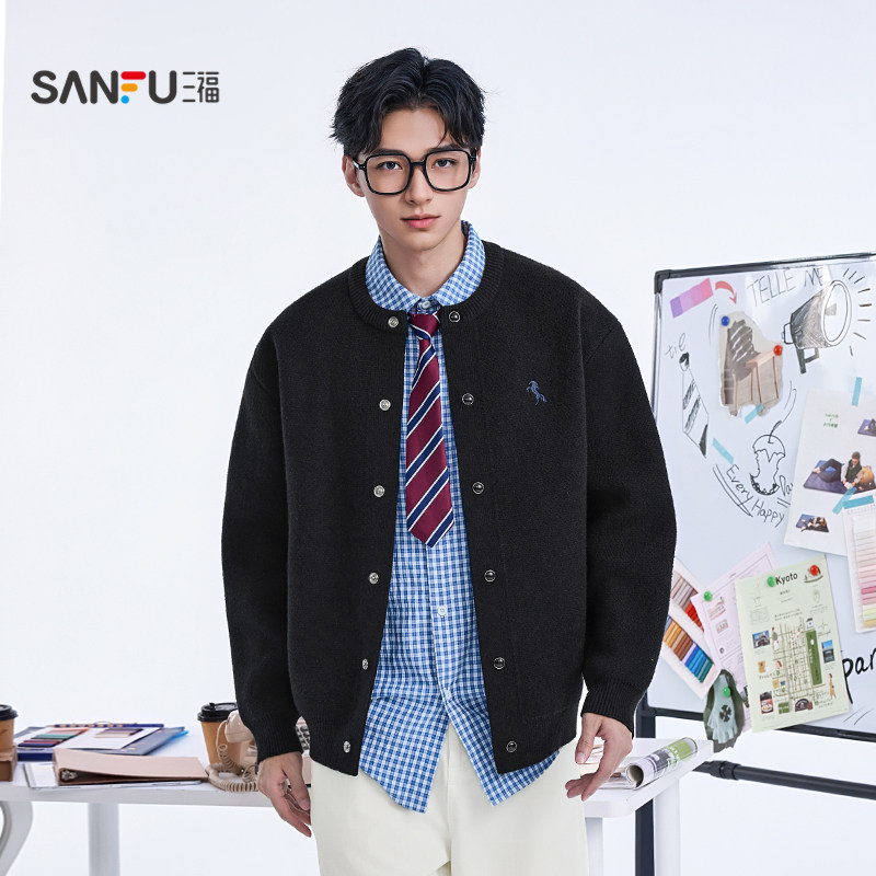 三福2025冬季男士彩扣刺绣开衫毛衣 时尚休闲微落上衣509413