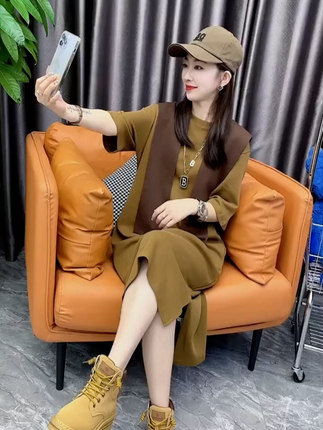 欧洲站2025早春新款披肩两件套宽松T恤裙女开叉中长款过膝连衣裙