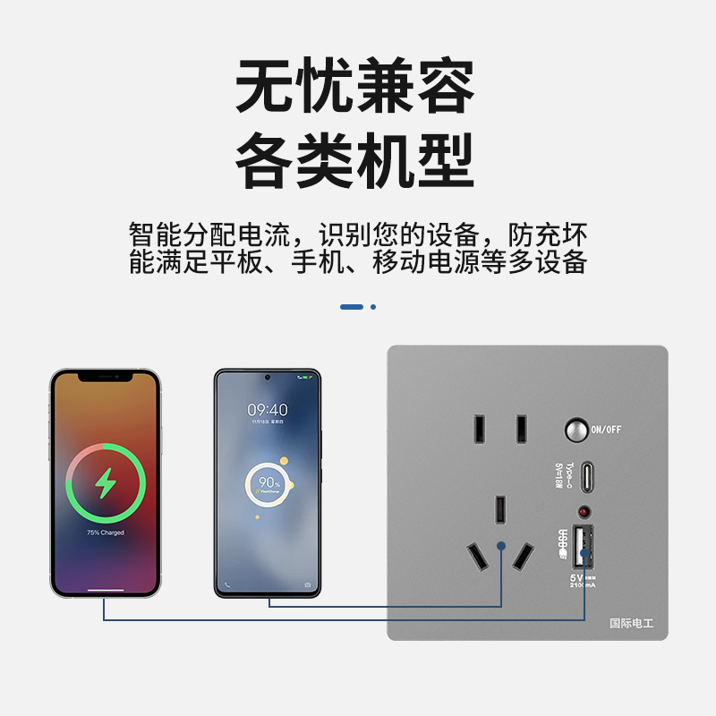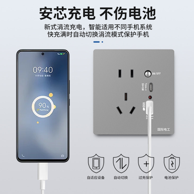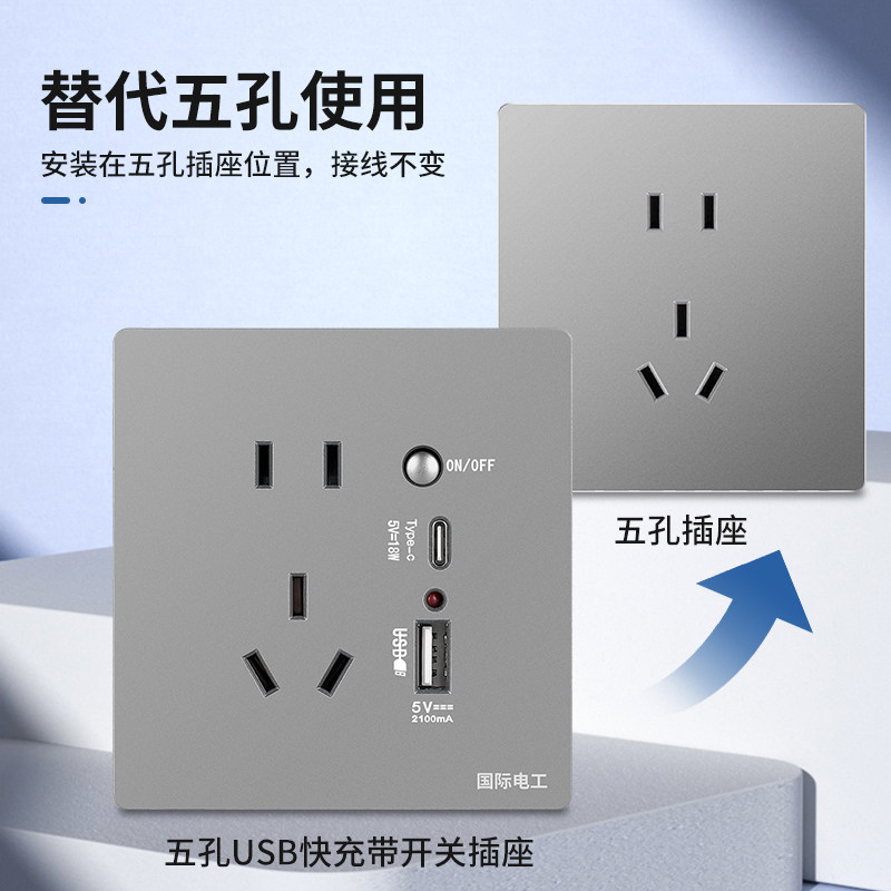 国际电工暗装86型type-C带开关5五孔USB插座手机充电快充家用面板