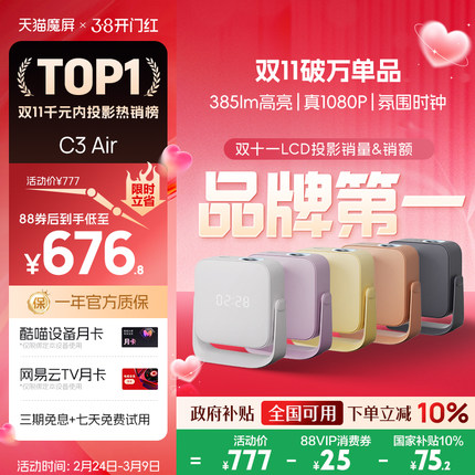 【政府补贴全国可用】天猫魔屏C3 Air投影仪影院智能便携家用超高清M2投影机封闭式光机真1080P卧室