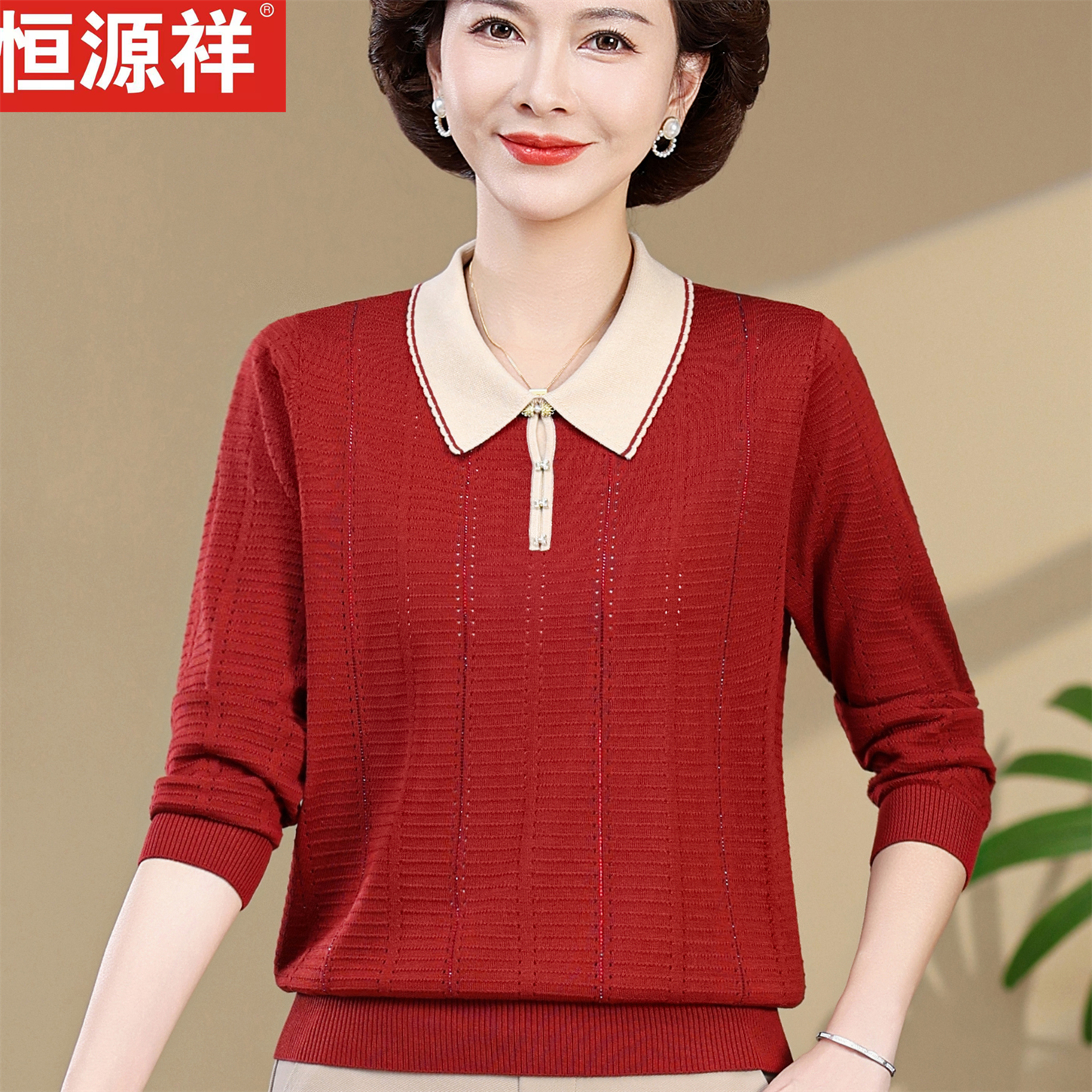 恒源祥春秋新款翻领中老年女装100%莱赛尔打底衫妈妈装套头针织衫
