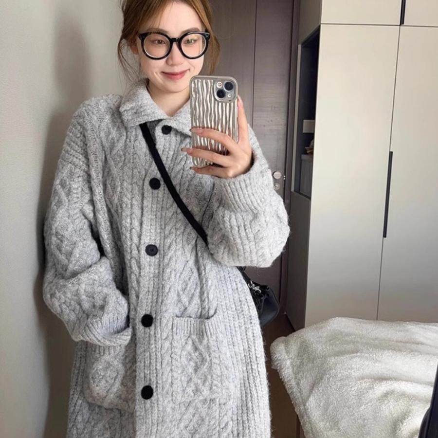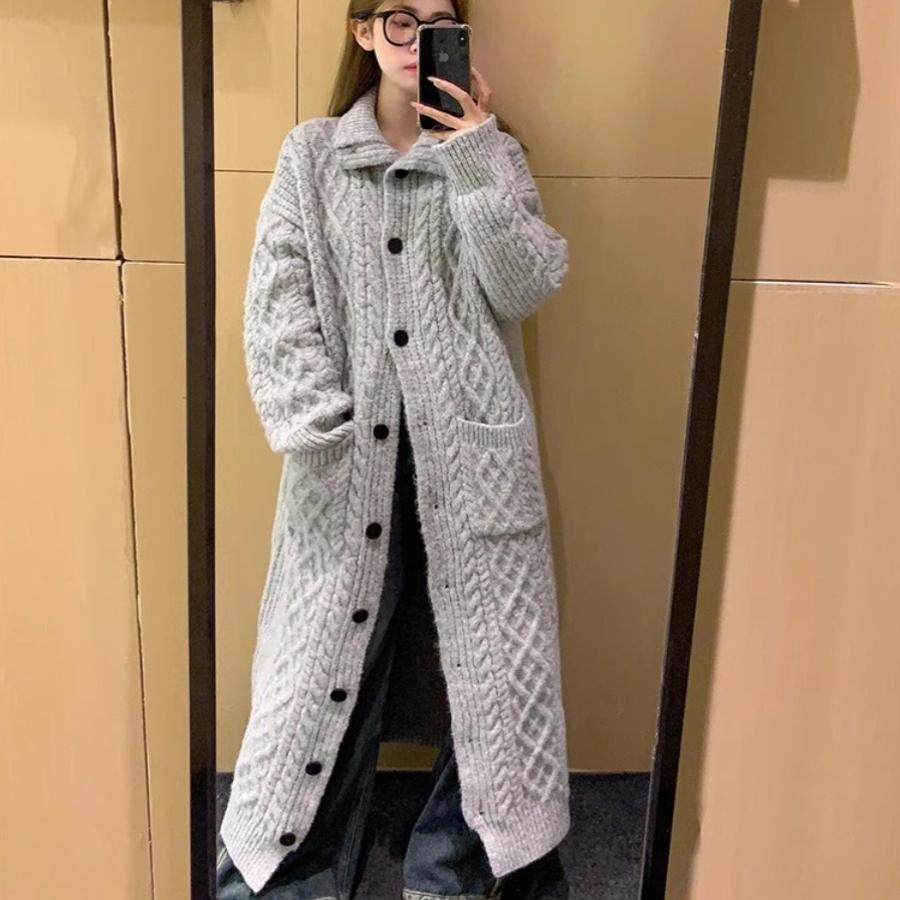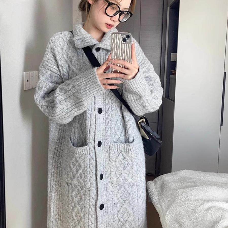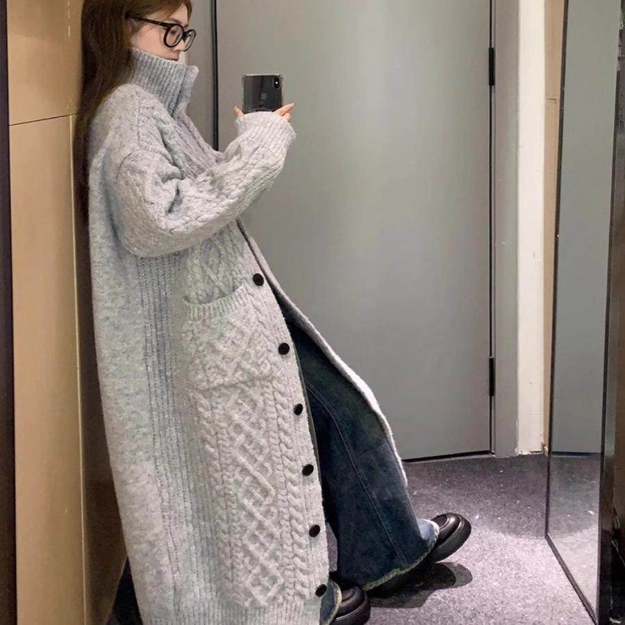 韩系慵懒氛围感穿搭长款过膝针织开衫灰色高领毛衣外套女秋冬加厚