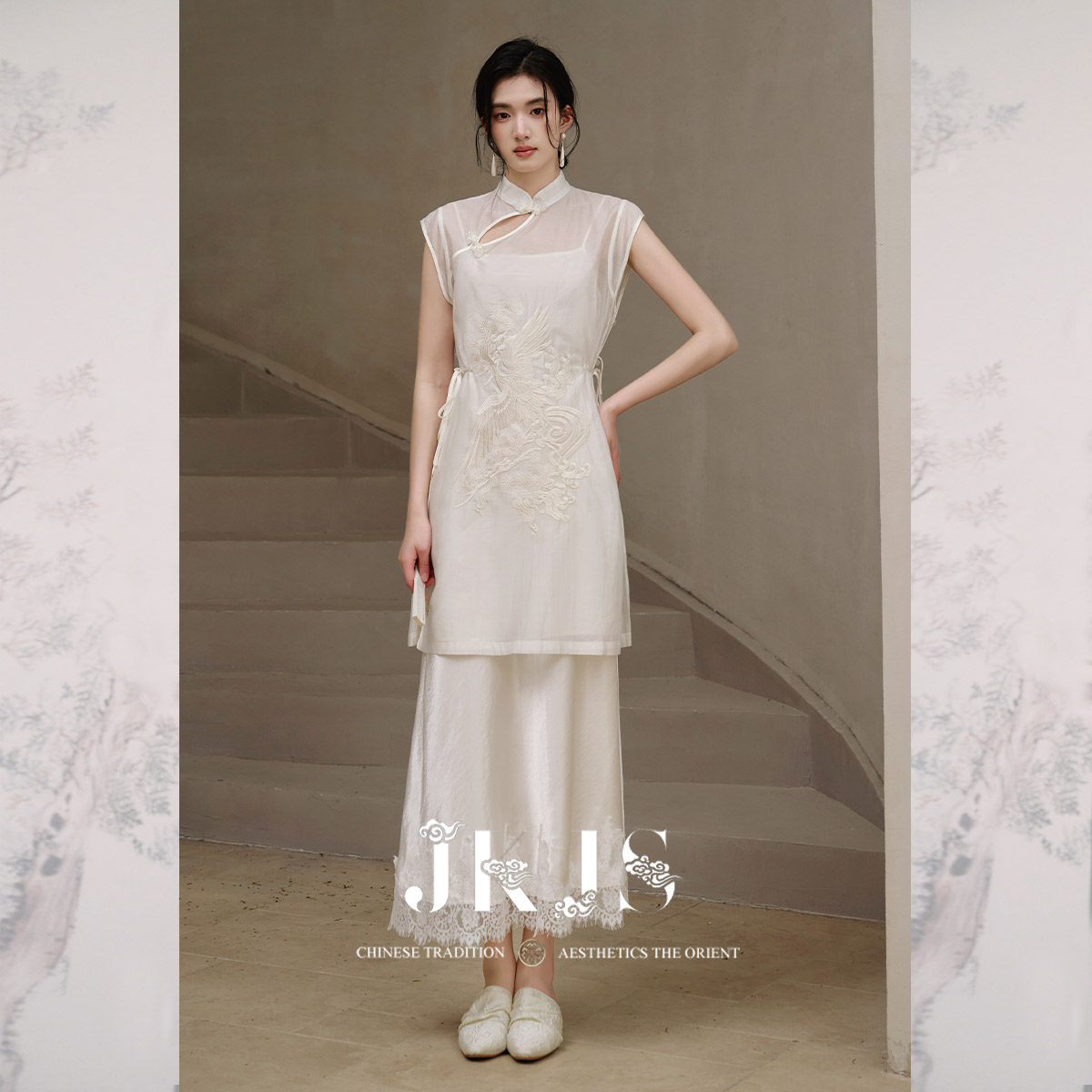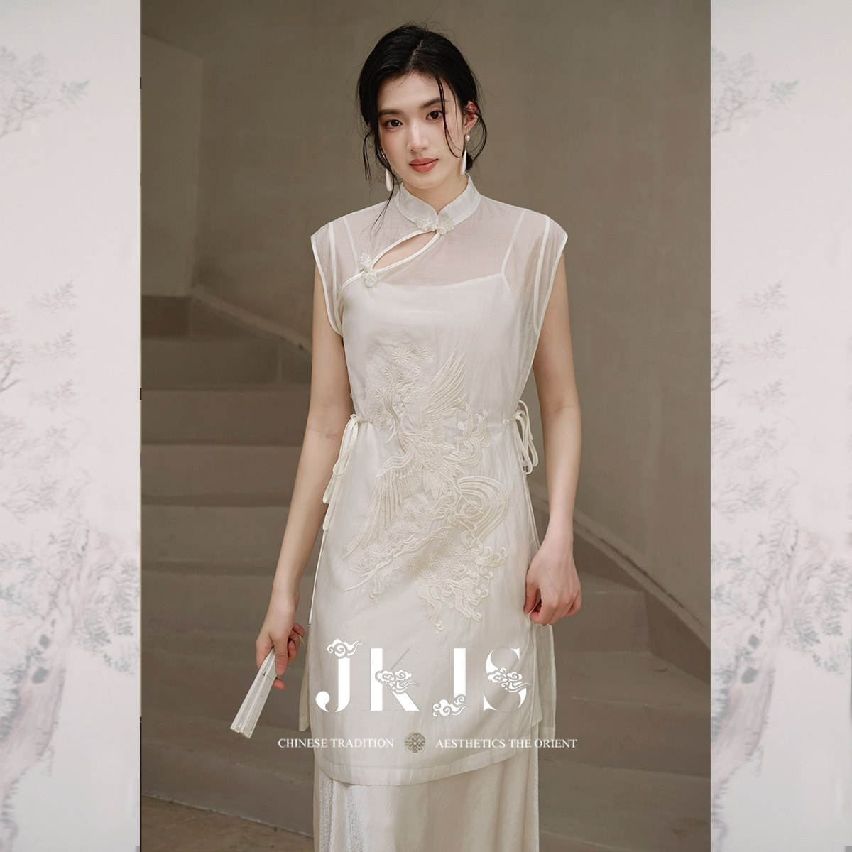 JKJS【无眠霜】重工绣花 天丝连衣裙女夏季无袖盘扣薄纱白色裙子