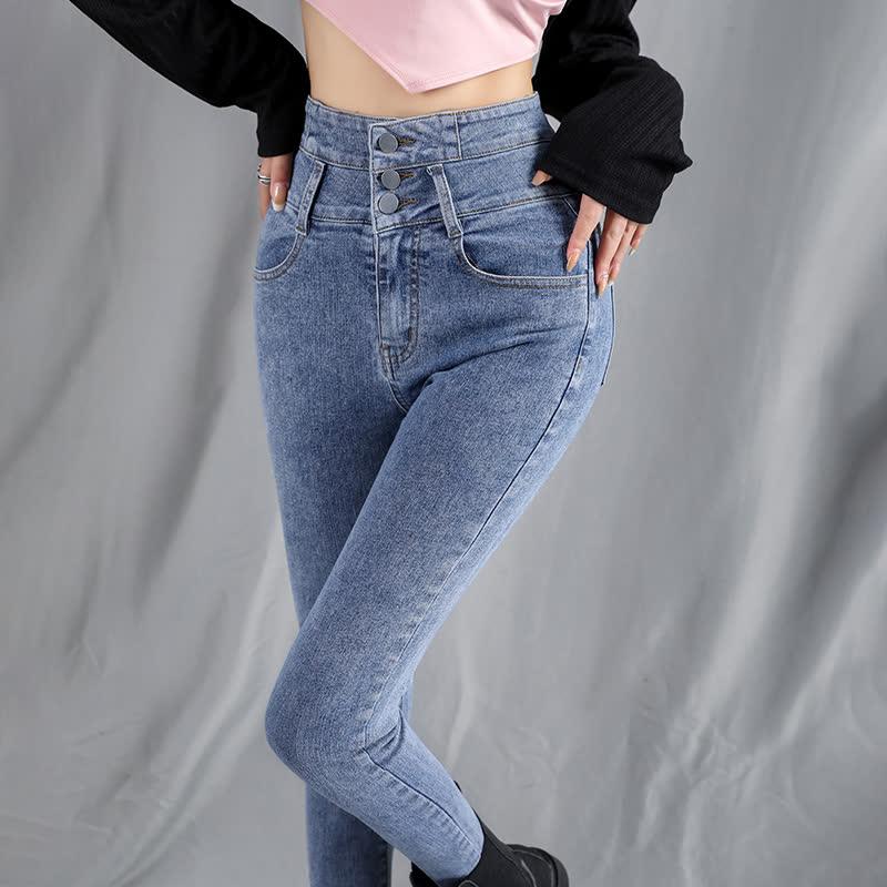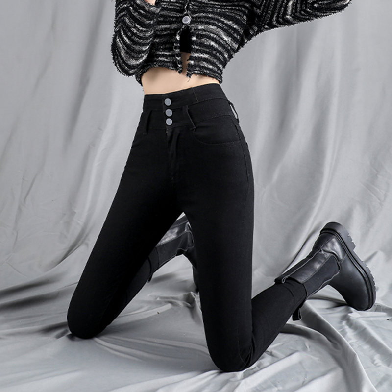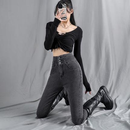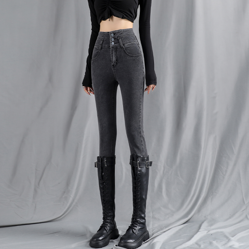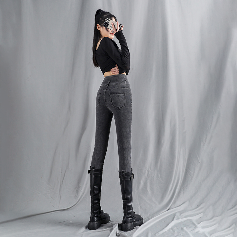 大码烟灰色高腰牛仔裤女2025年新款春季弹力紧身小脚九分修身长裤