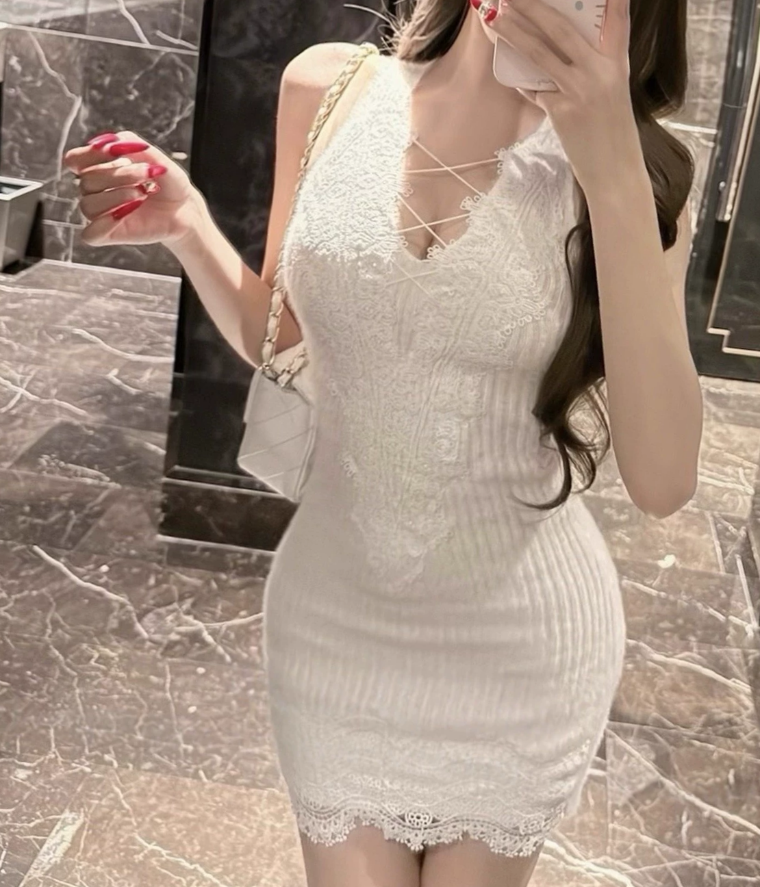 *华籍美女*性感绑带深v蕾丝V领内搭连衣裙咖色白色背心裙子短秋冬