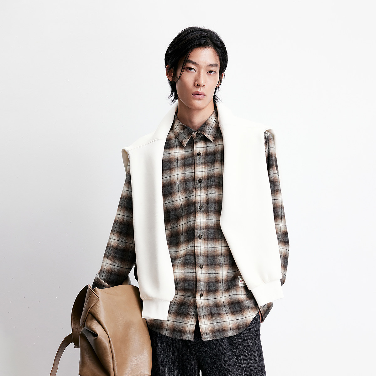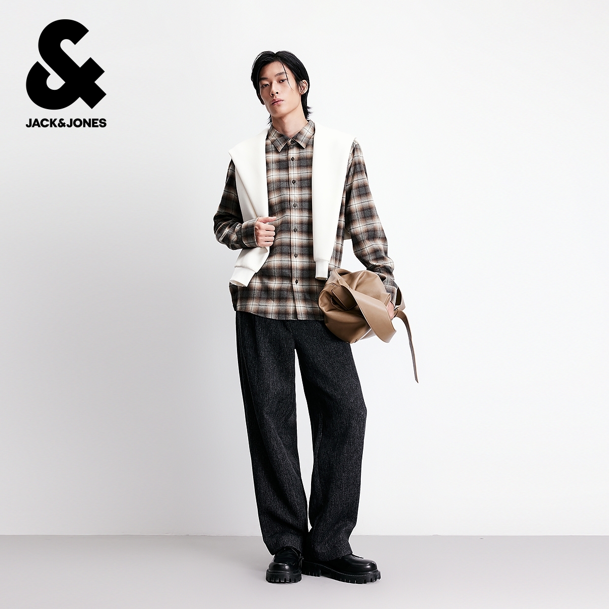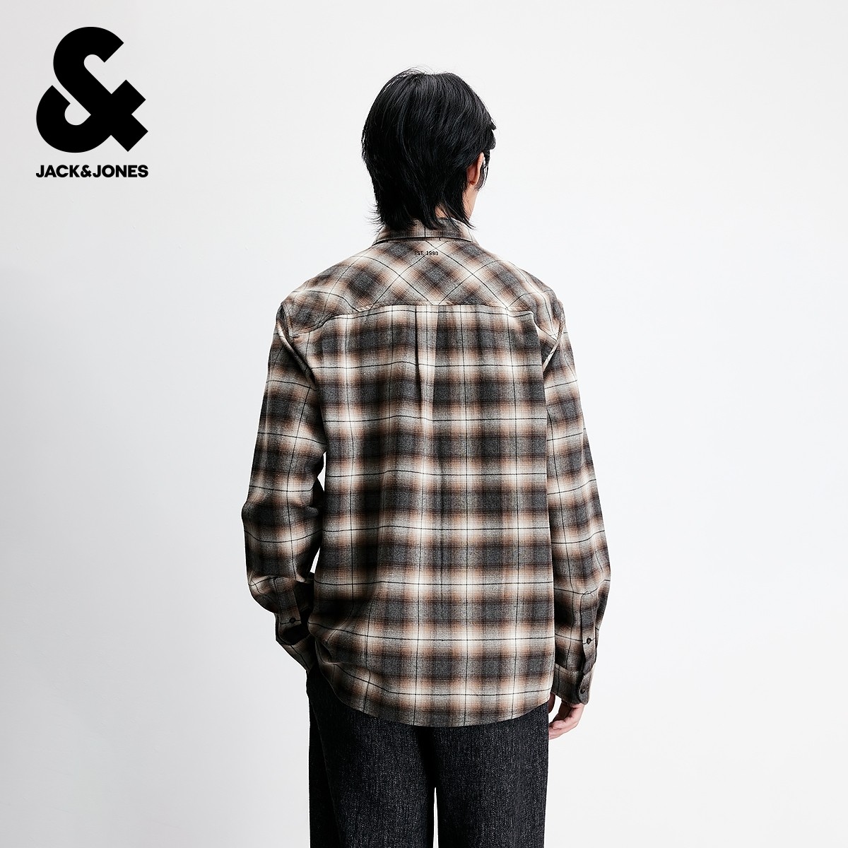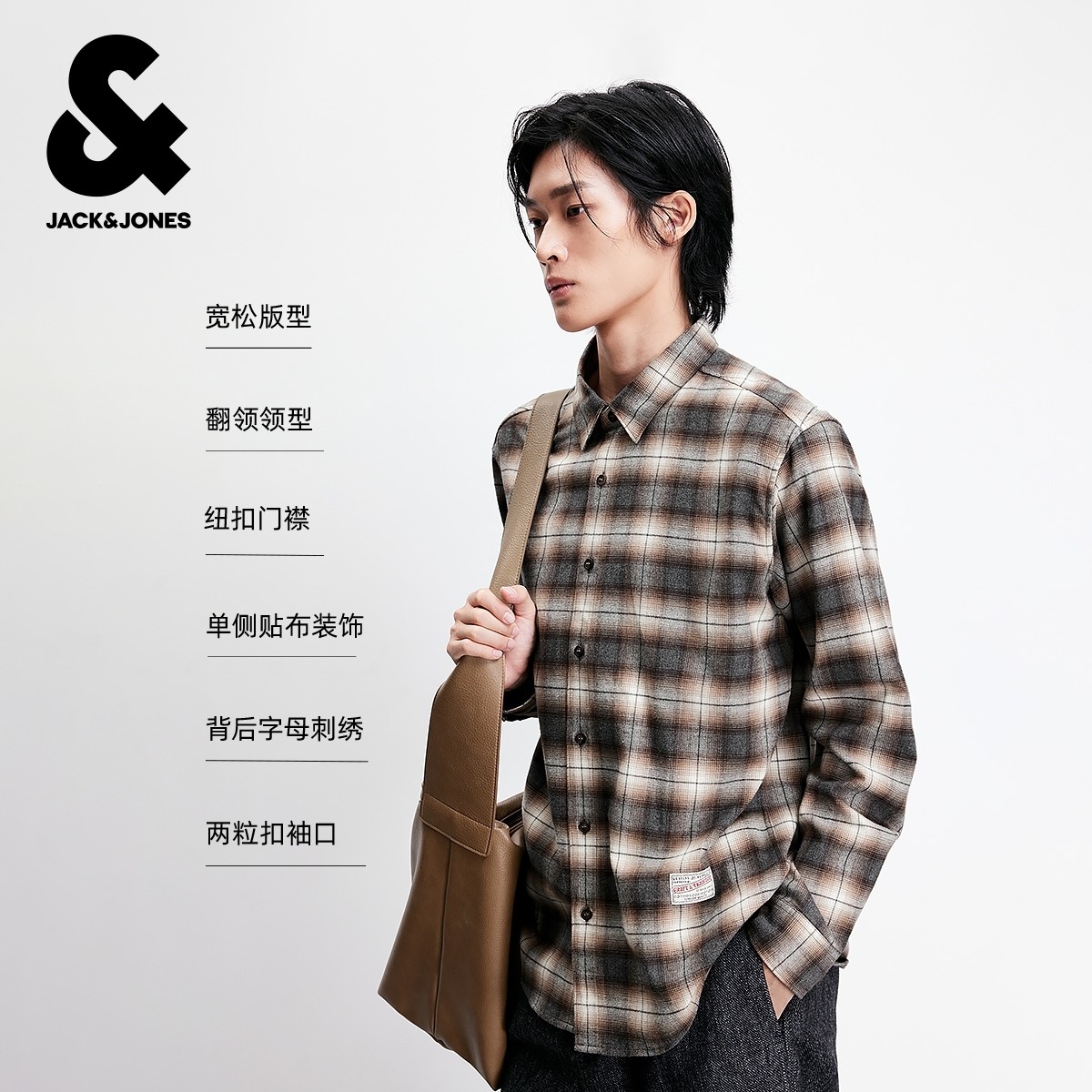 杰克琼斯男装2025年冬季新款衬衫经典褐色小格纹纯棉舒适上衣外套
