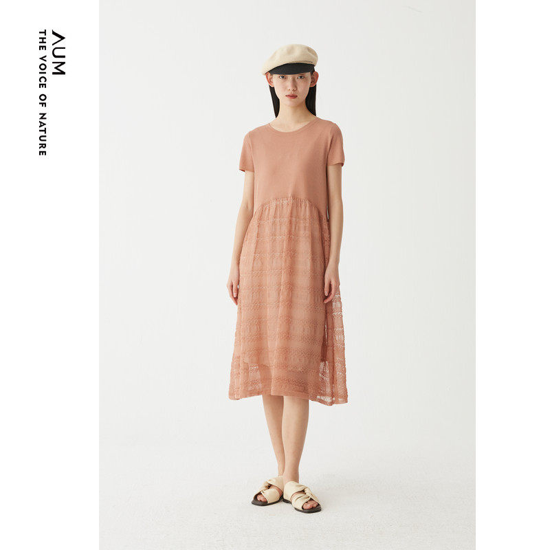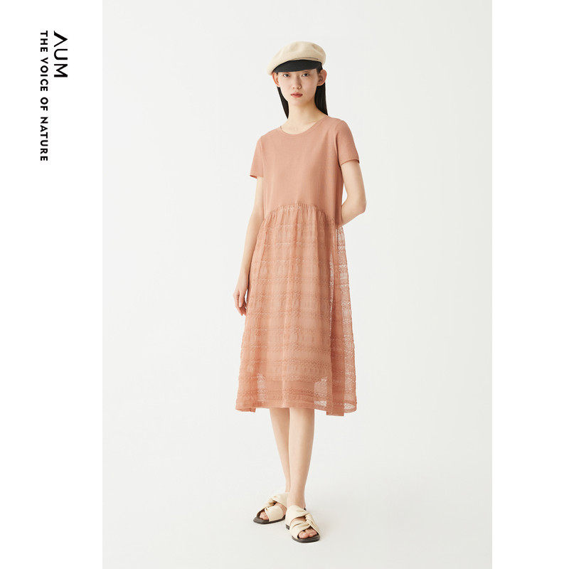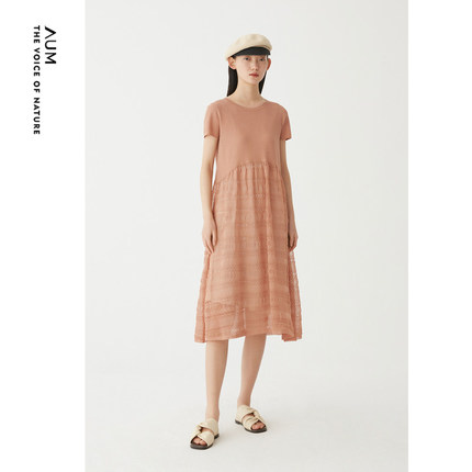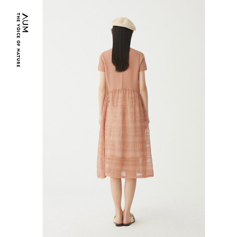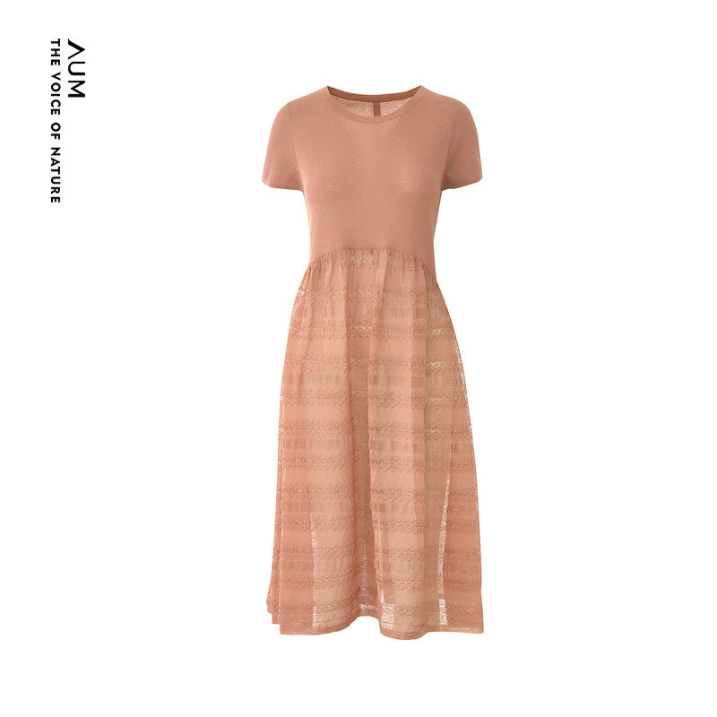 AUM噢姆夏季镂空设计感裙子粉色针织拼接连衣裙娃娃裙