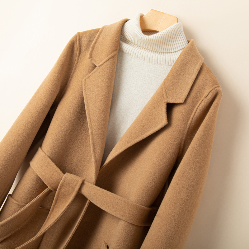 秋冬新款双面羊绒大衣女中长款过膝西装领纯色系带浴袍羊毛呢外套