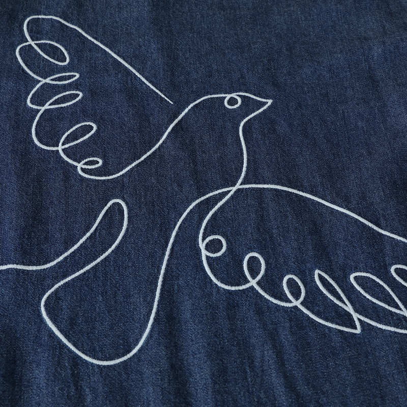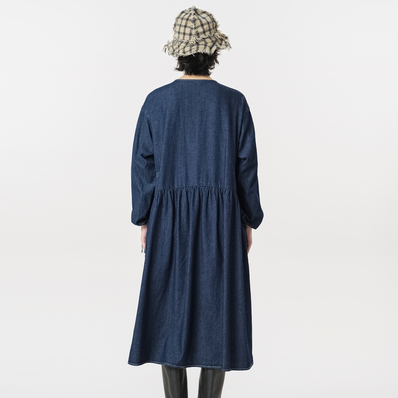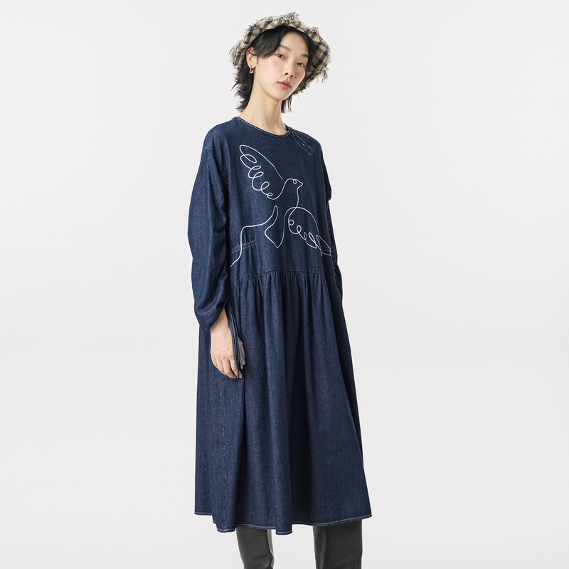 MOVEUP幻走2023冬季新款.FUN系列纯棉绣花抽褶设计师牛仔连衣裙