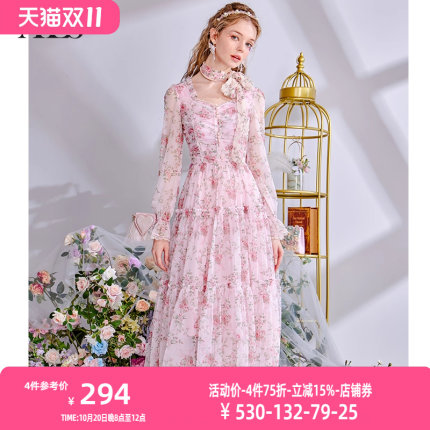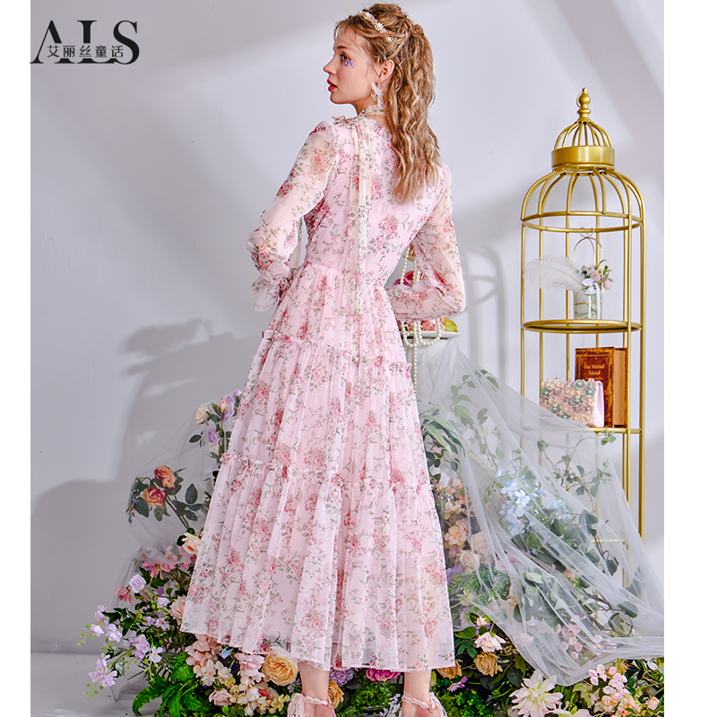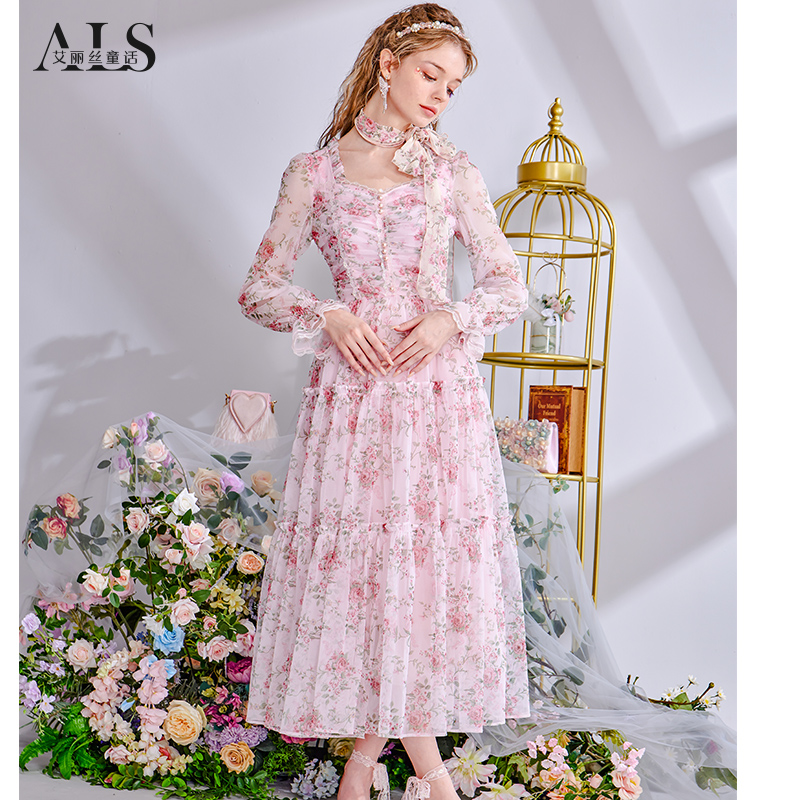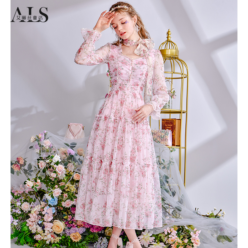 艾丽丝2025秋季新款甜美粉色中长款连衣裙长袖超仙气质公主风女裙