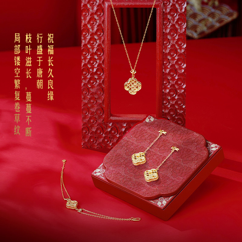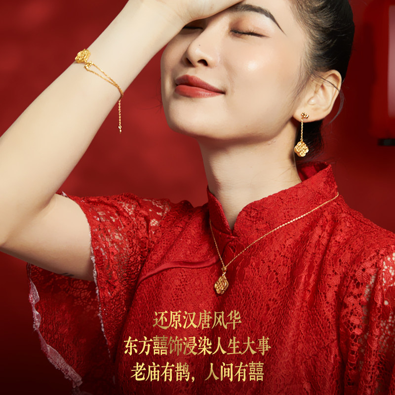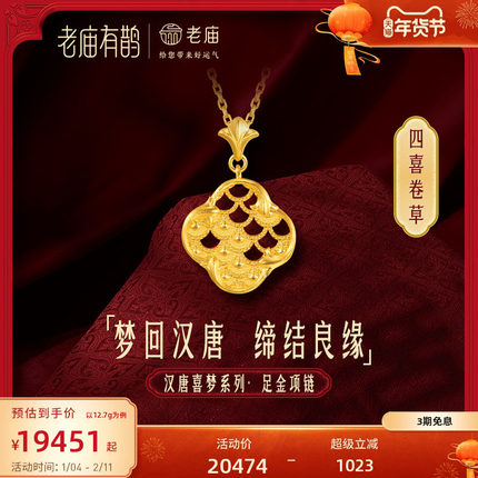 老庙有鹊黄金足金999汉唐文化卷草纹四喜龙鳞项链婚嫁结婚新三金