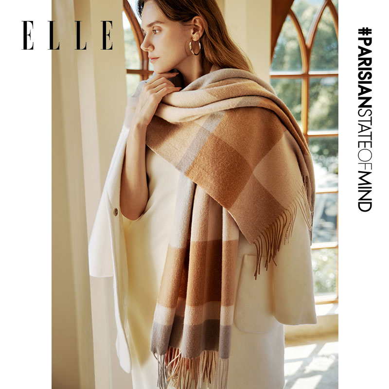 ELLE100%羊毛围巾女士秋冬季新款格子披肩保暖加厚围脖送礼礼盒A