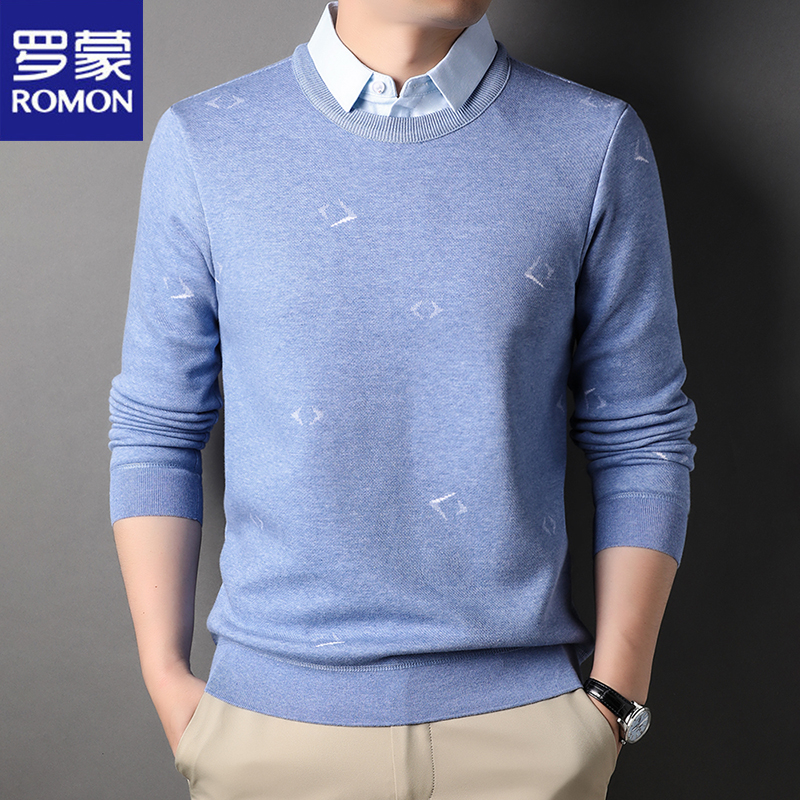 罗蒙男士假两件毛衣衬衫领秋冬季中青年时尚装休闲针织打底衫上衣