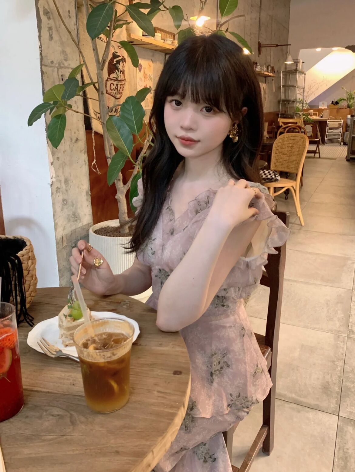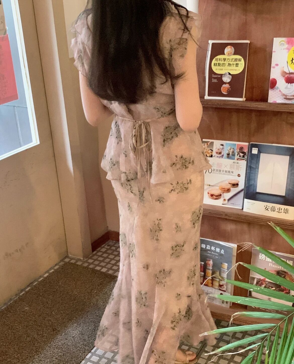 哚琦琦D家无尽夏印花收腰飞袖衬衫上衣/鱼尾半身裙套装甜美两件套