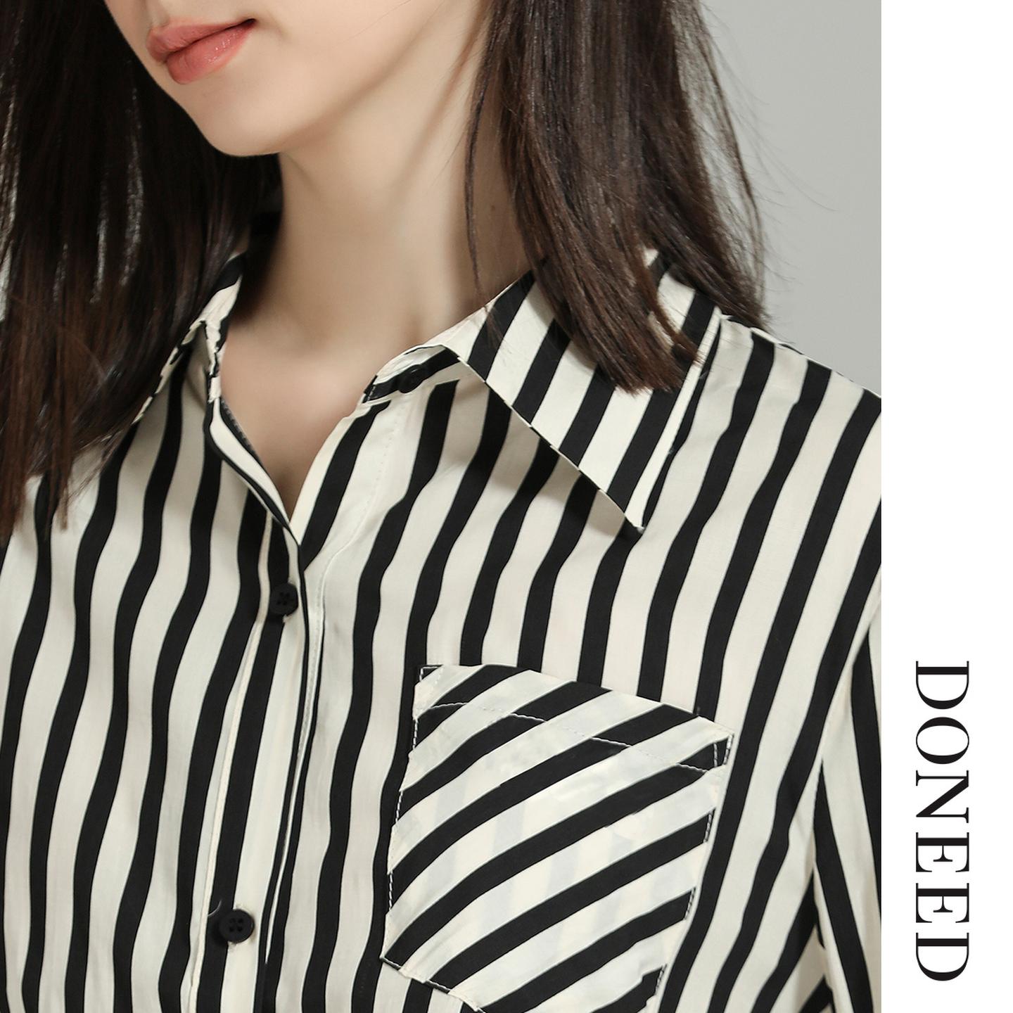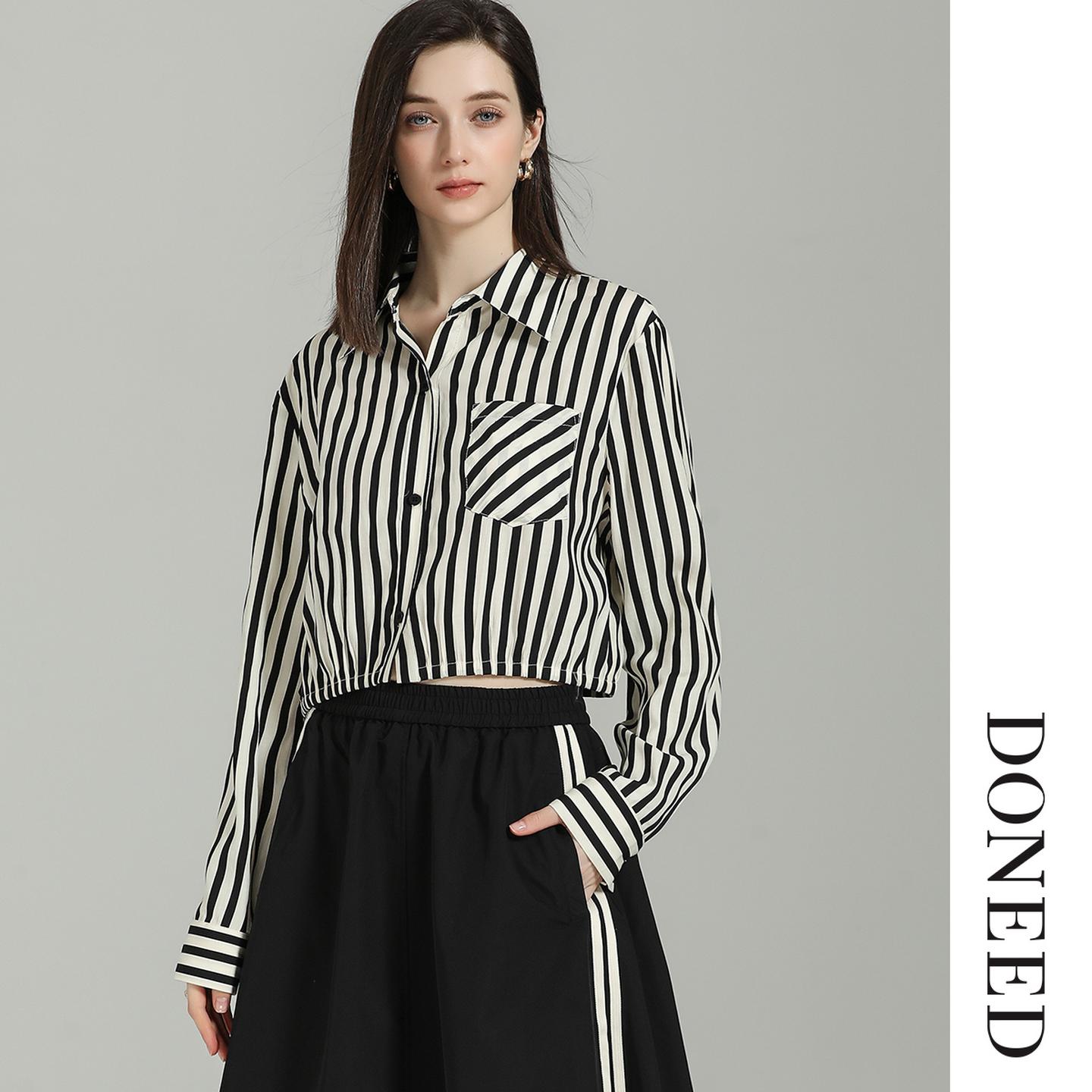 DONEED春夏款气质通勤时尚条纹长袖衬衫贴袋茧型短款上衣女
