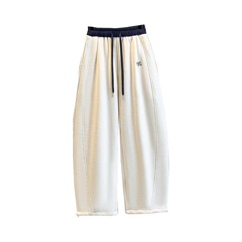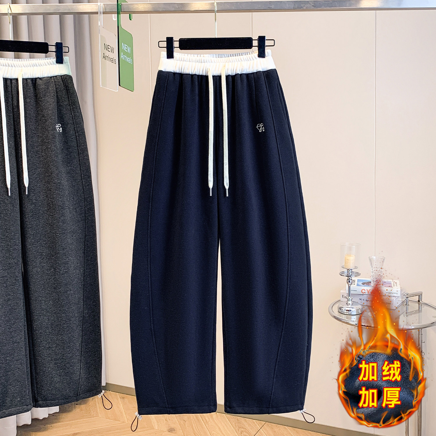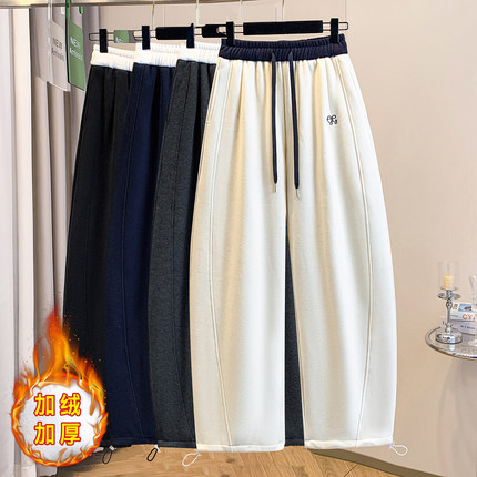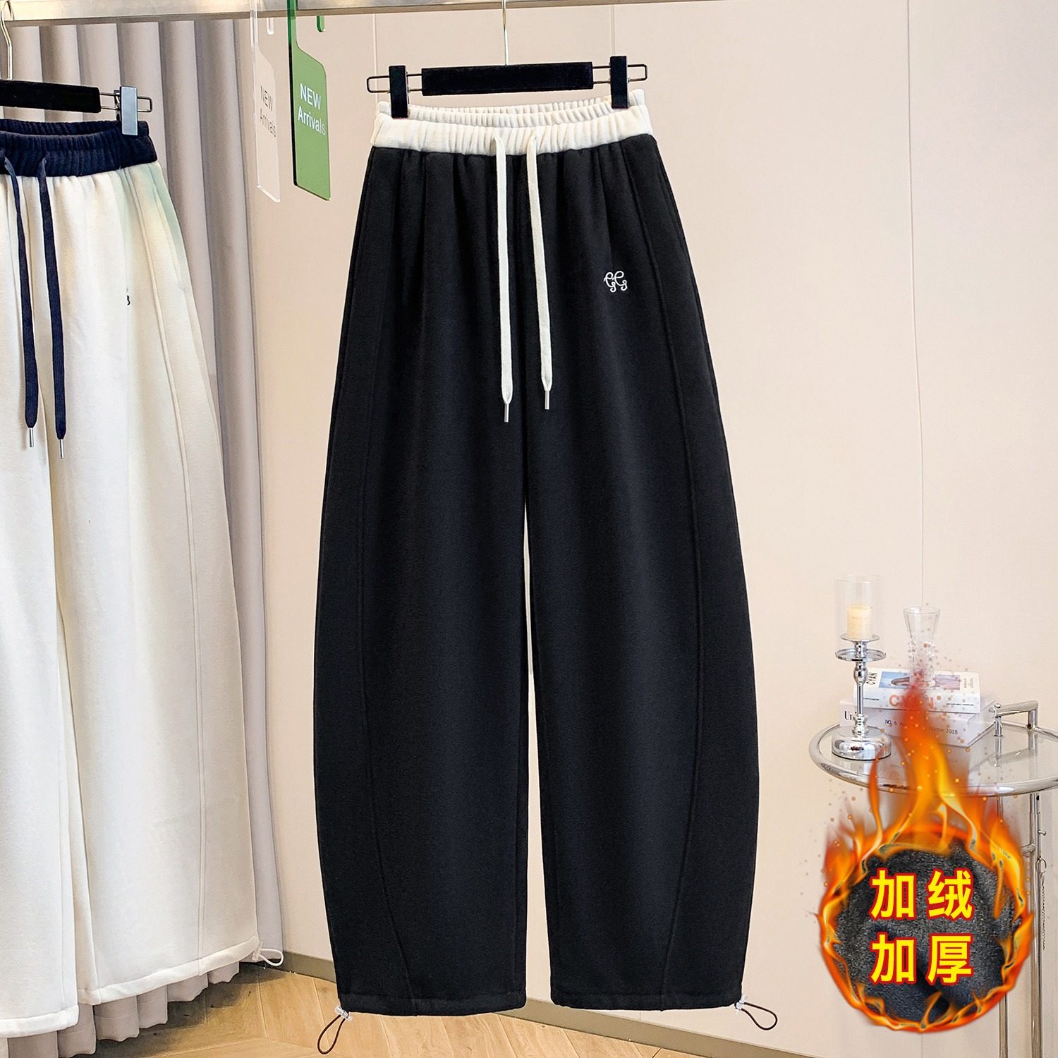 秋冬新款加绒保暖撞色阔腿裤松紧腰系带两穿弯刀裤加厚哈伦糯米裤