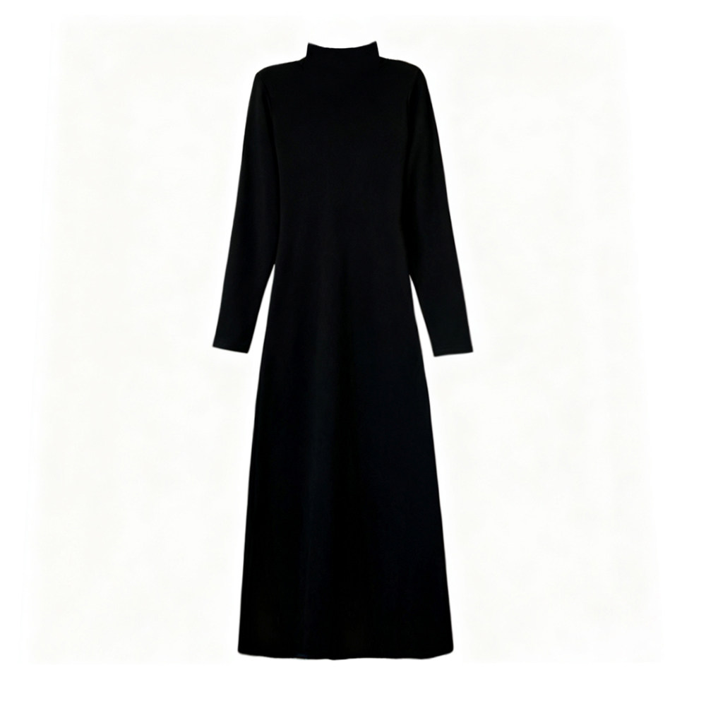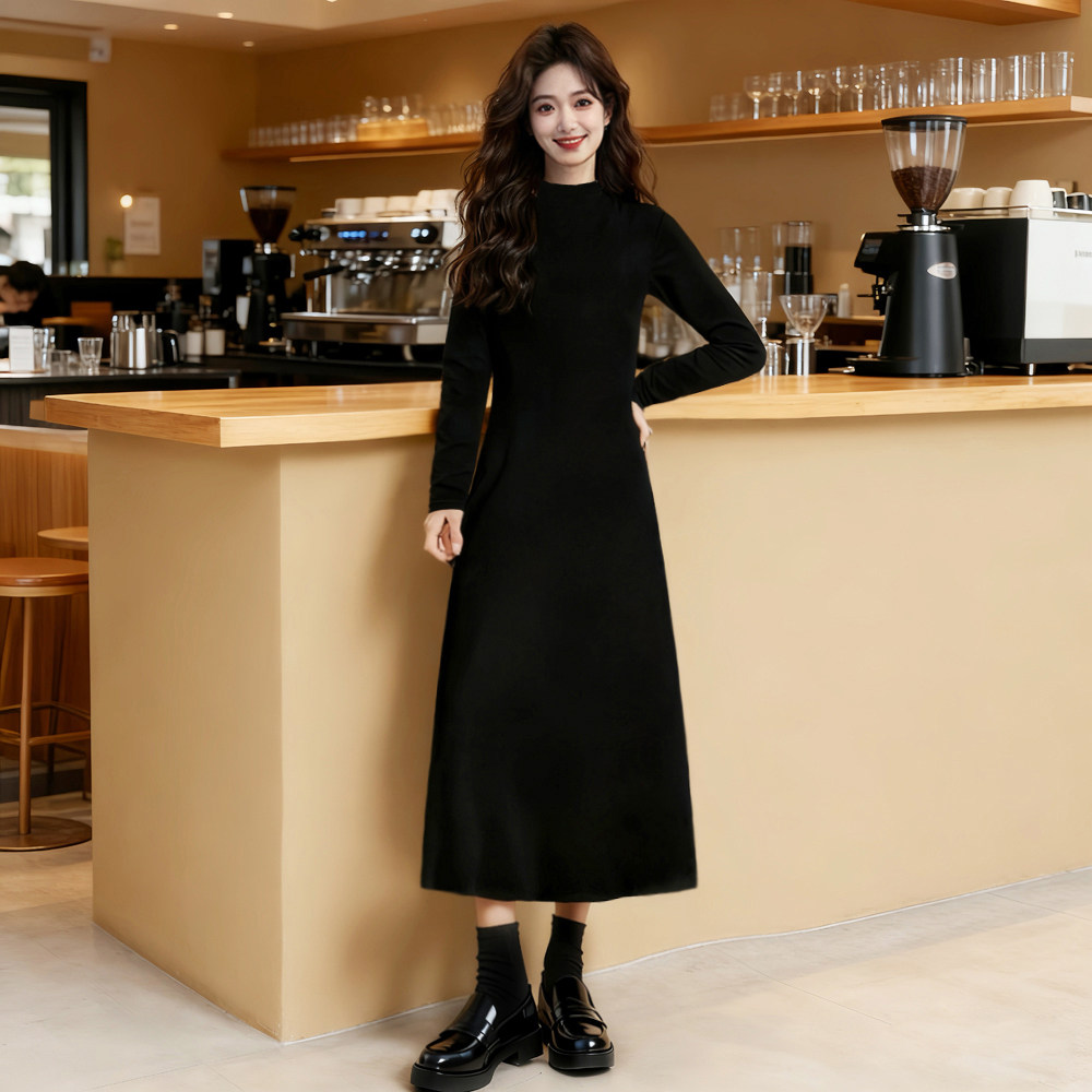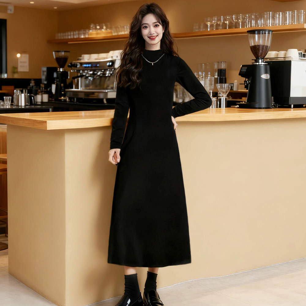 秋冬长袖半高领长裙子A字裙显瘦宽松外穿打底极简风黑色连衣裙女