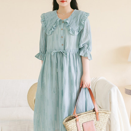 夏仙女蓝色重工气质连衣裙大码大翻领浪漫宽松裙子